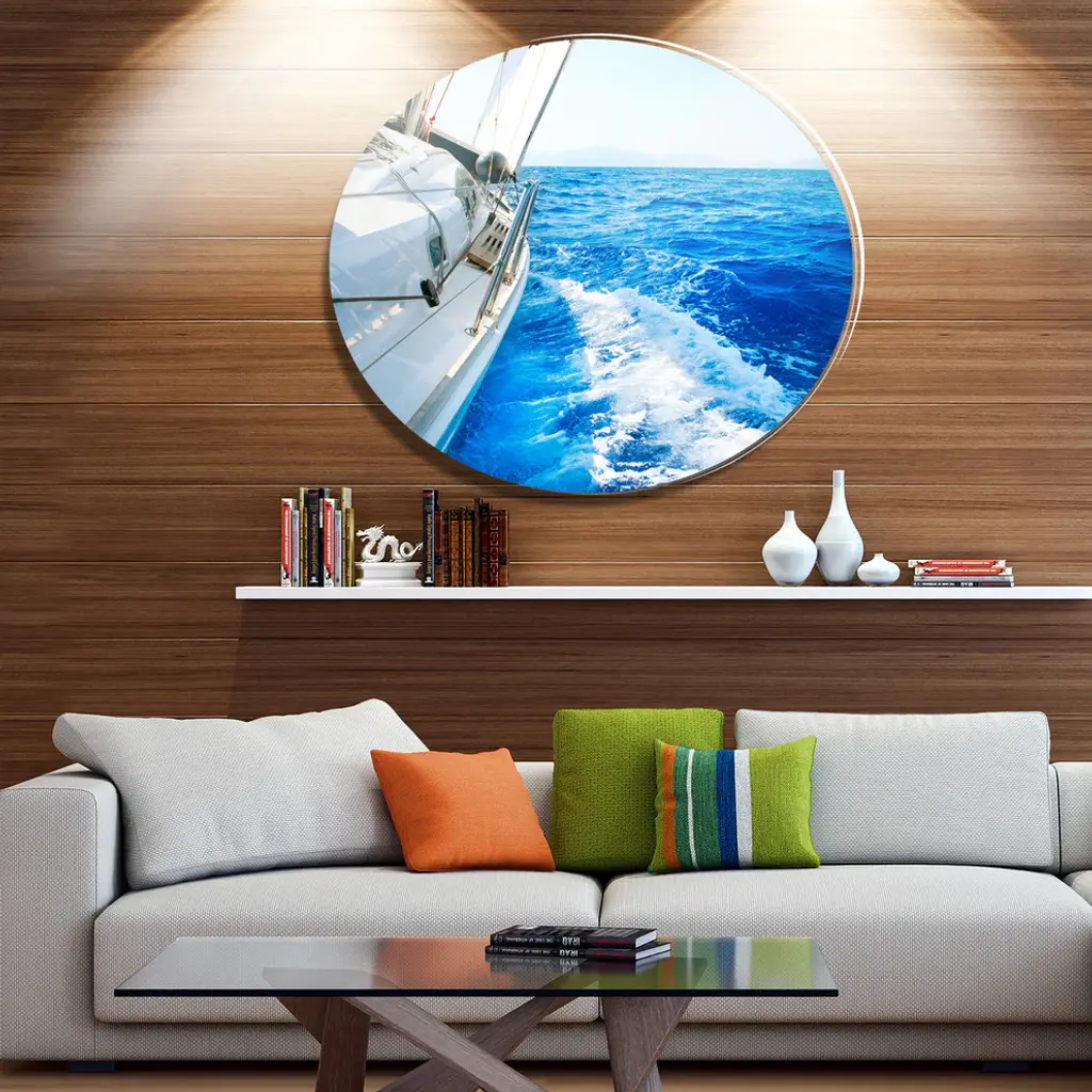 Bring Contemporary Abstraction to your home with this large Circle Metal wall art. This White Sailing Yacht in Blue Sea Metal Artwork makes it the focal point of any room or office. - White Gloss Coating ensures colors are extra vibrant with light reflection.- Aluminum grade Sheet Metal with 1 inch mounting frame on the back giving the illusion that the artwork is floating on the wall..- Mounting Brackets are included along with instructions.- High Quality Digital images are created directly into a glossy aluminum panel producing a stunning and captivating print into the glossy finish of the metal.- Water, Fire and Scratch resistant HD Aluminum panels.- Looks better than any photo paper and guaranteed to last at least 20 years- Easy to clean with a microfiber cloth. Colors are far superior to regular Canvas Art. - Easy to Hang