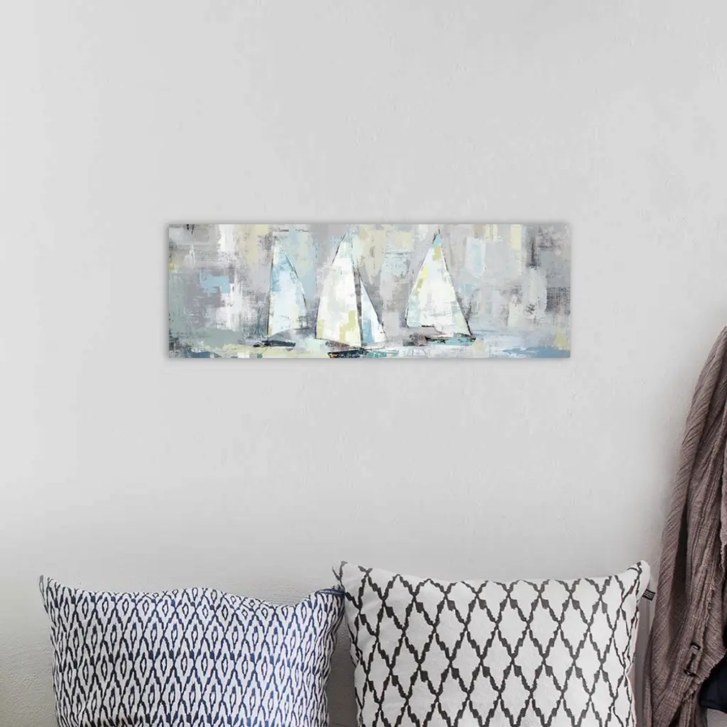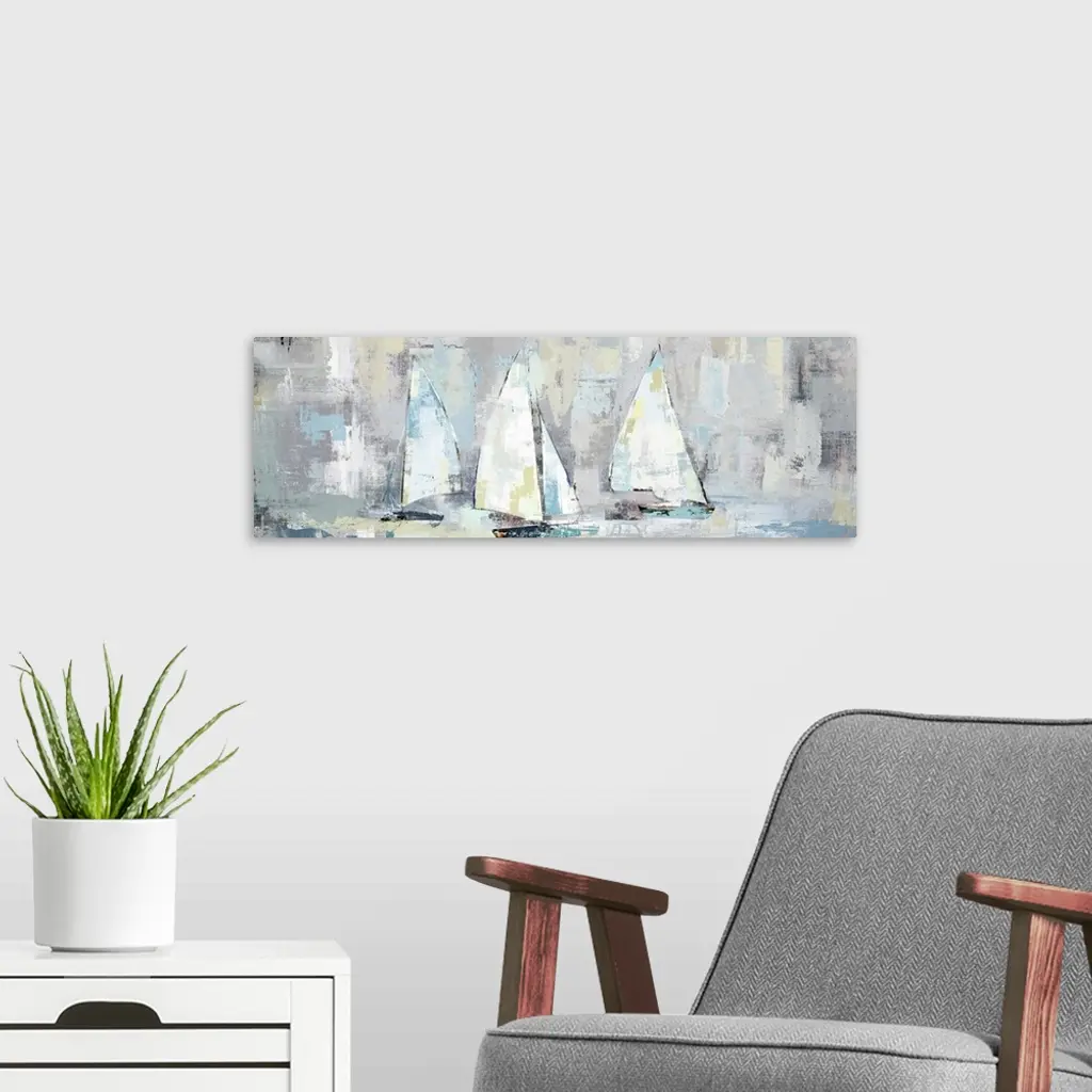 A large panoramic painting of a group of sailboats with muted patches of yellow, blue and gray.