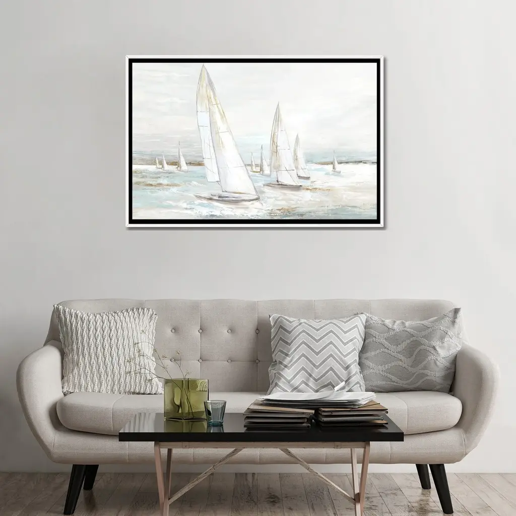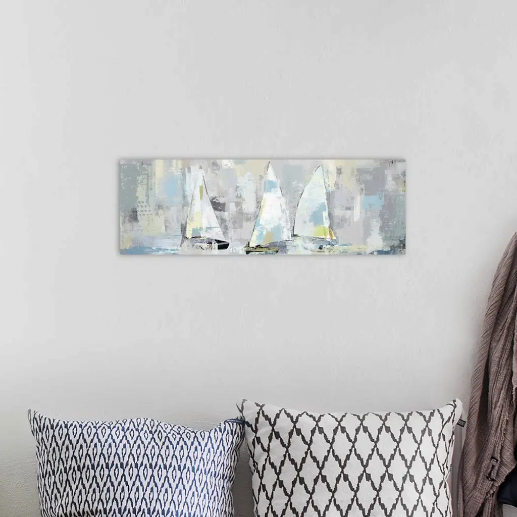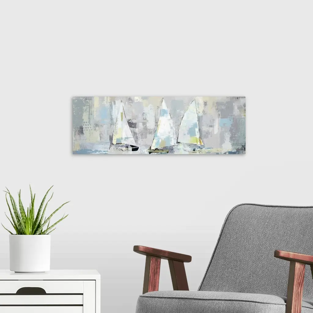 A large panoramic painting of a group of sailboats with muted patches of yellow, blue and gray.