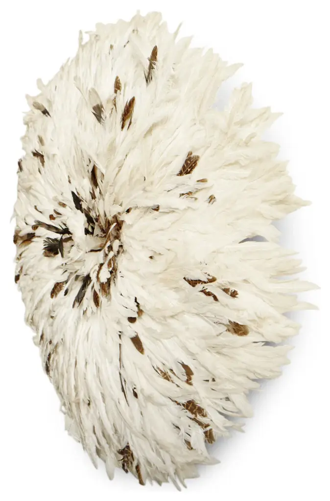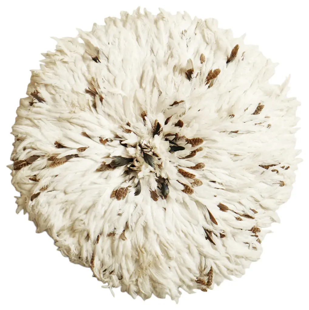 Beautiful hand crafted original JuJu hat wall art. These attractive natural bird feather art form were originally worn as a headdress by dignitaries, chiefs, and the royal families also wear these ceremonial hats as a symbol of prosperity and wealth. Created from woven natural or brightly colored dyed wild chicken feathers then tied to straps and pulled open into a stunning circular display. Each is unique. Sizes vary approx. 28" - 32" diameter.