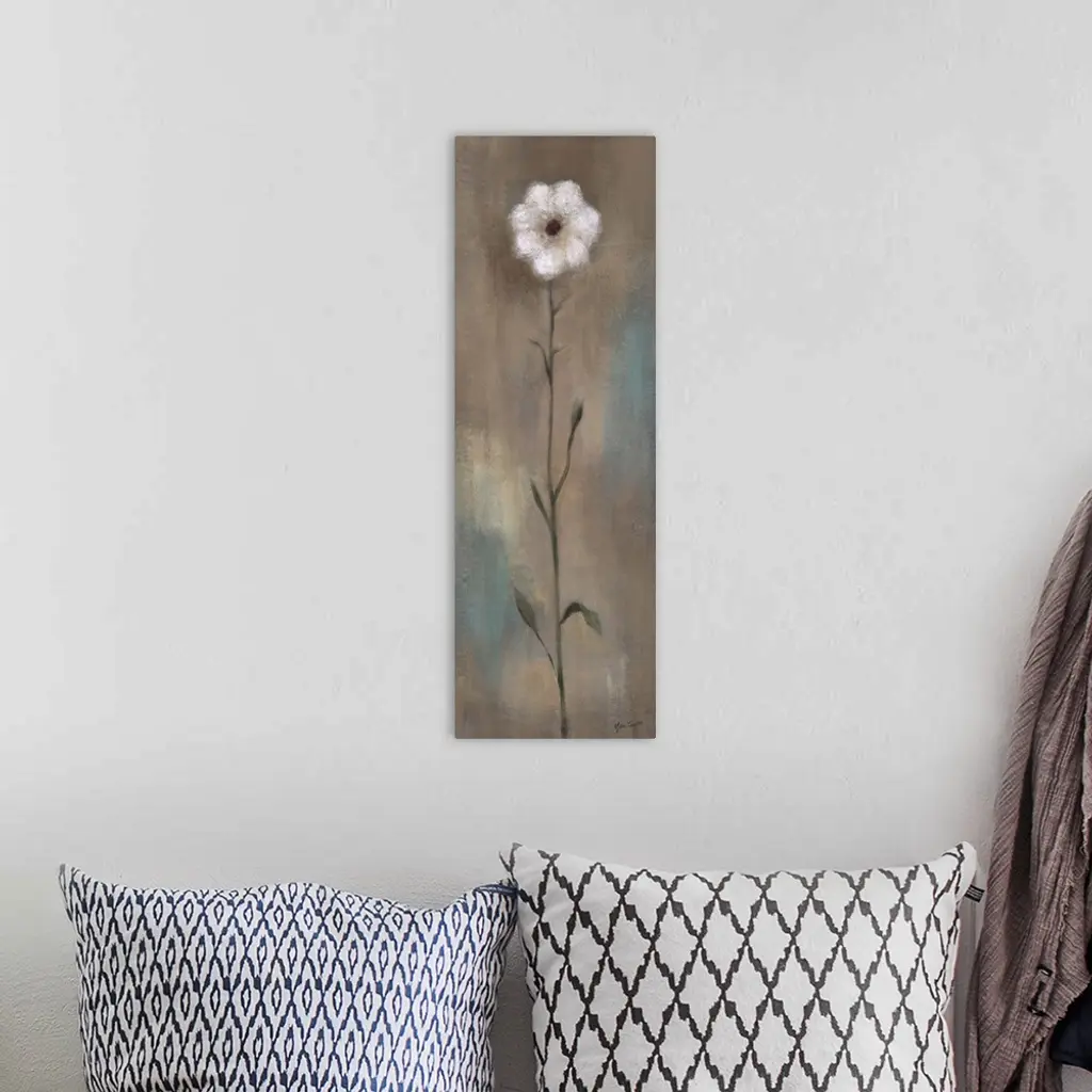 Contemporary painting of a single white flower with a long stem against an earth toned background.