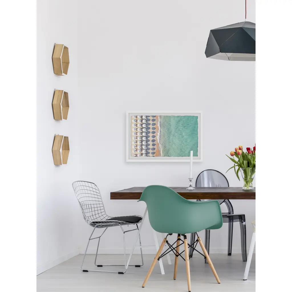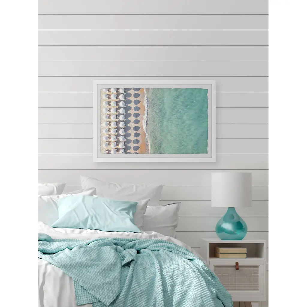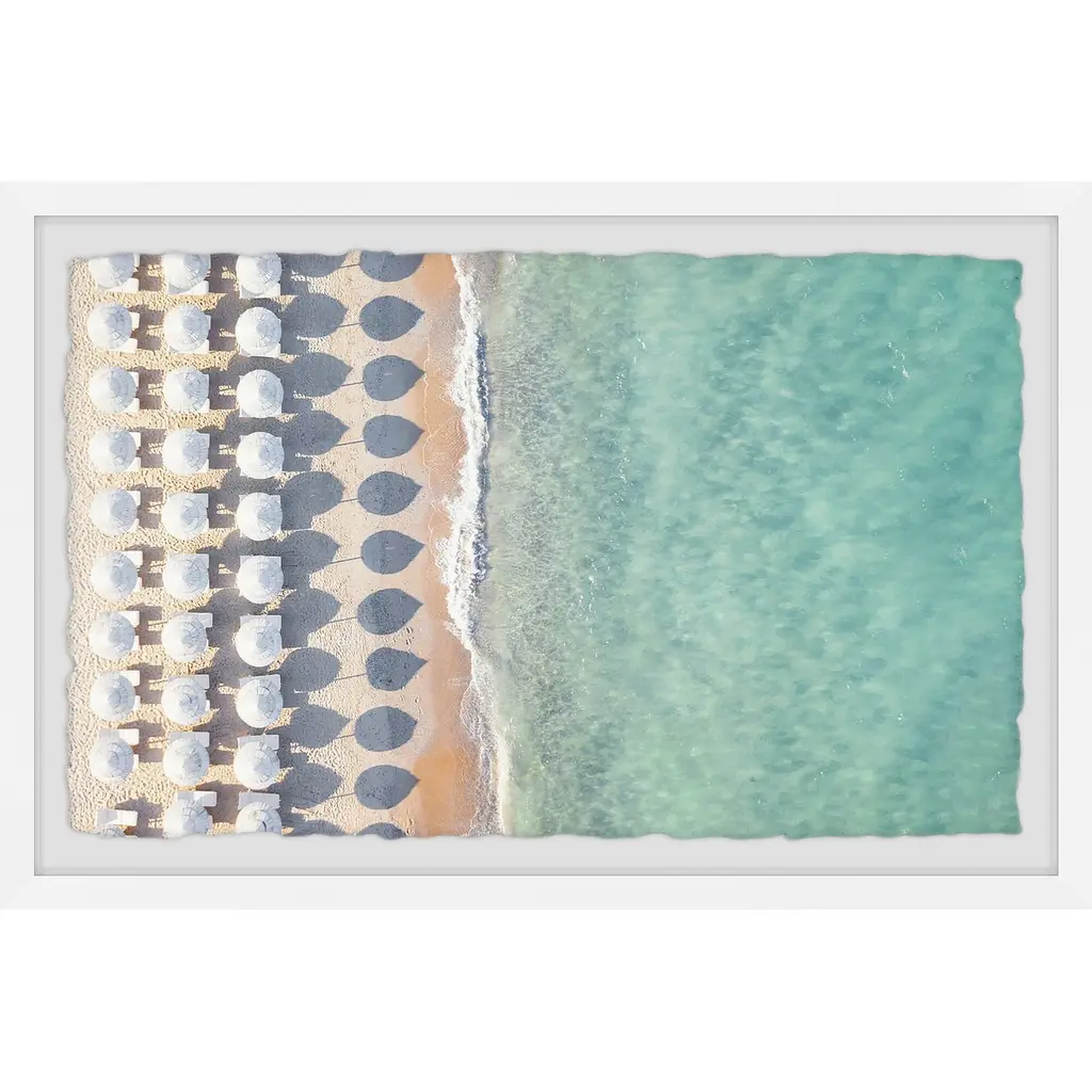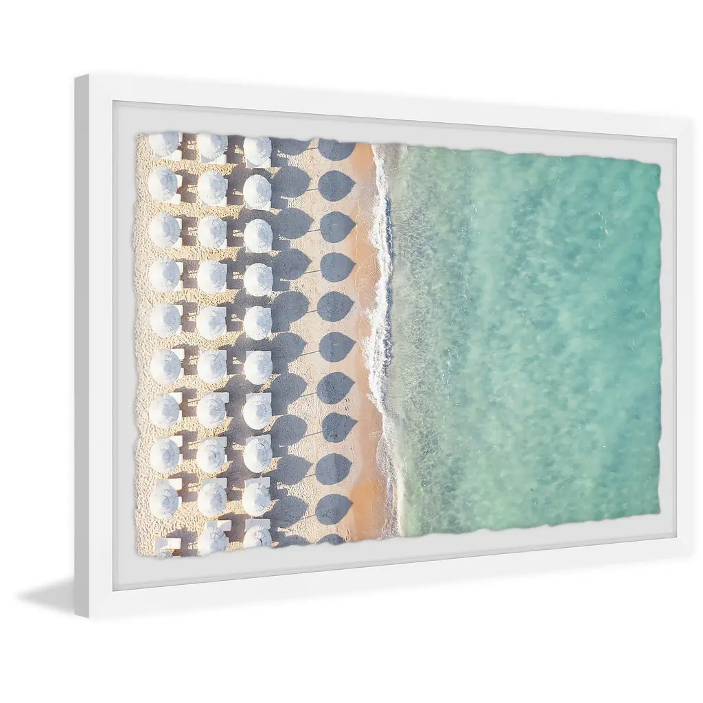 Sure to brighten any room, this photographic print features a visually pleasing take of white umbrellas on the empty beach. Proudly printed in the USA, this piece is printed on high quality archive paper and professionally hand-framed. With wall-mounting hooks included, this artful accent is ready to hang up as soon as it reaches your front door. • Top quality Giclee print on high resolution Archive Paper • Hand cut deckled edges • High quality durable non-warping frame • Finished under shatter resistant plexiglass • Arrives ready to hang • Includes a certificate of authenticity • Printed in the USA