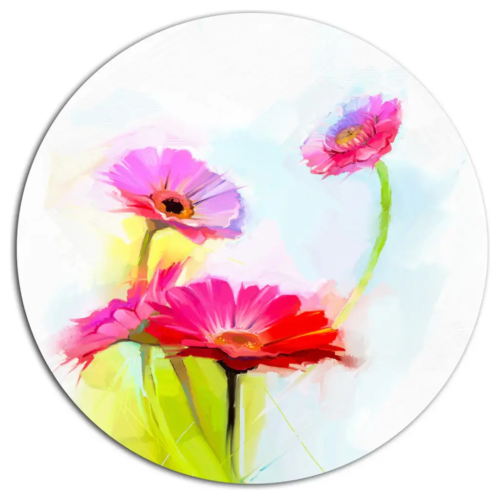 Bring Contemporary Abstraction to your home with this large Circle Metal wall art. This White Sunflower and Gerbera Flowers Metal Artwork makes it the focal point of any room or office. - White Gloss Coating ensures colors are extra vibrant with light reflection.- Aluminum grade Sheet Metal with 1 inch mounting frame on the back giving the illusion that the artwork is floating on the wall..- Mounting Brackets are included along with instructions.- High Quality Digital images are created directly into a glossy aluminum panel producing a stunning and captivating print into the glossy finish of the metal.- Water, Fire and Scratch resistant HD Aluminum panels.- Looks better than any photo paper and guaranteed to last at least 20 years- Easy to clean with a microfiber cloth. Colors are far superior to regular Canvas Art. - Easy to Hang
