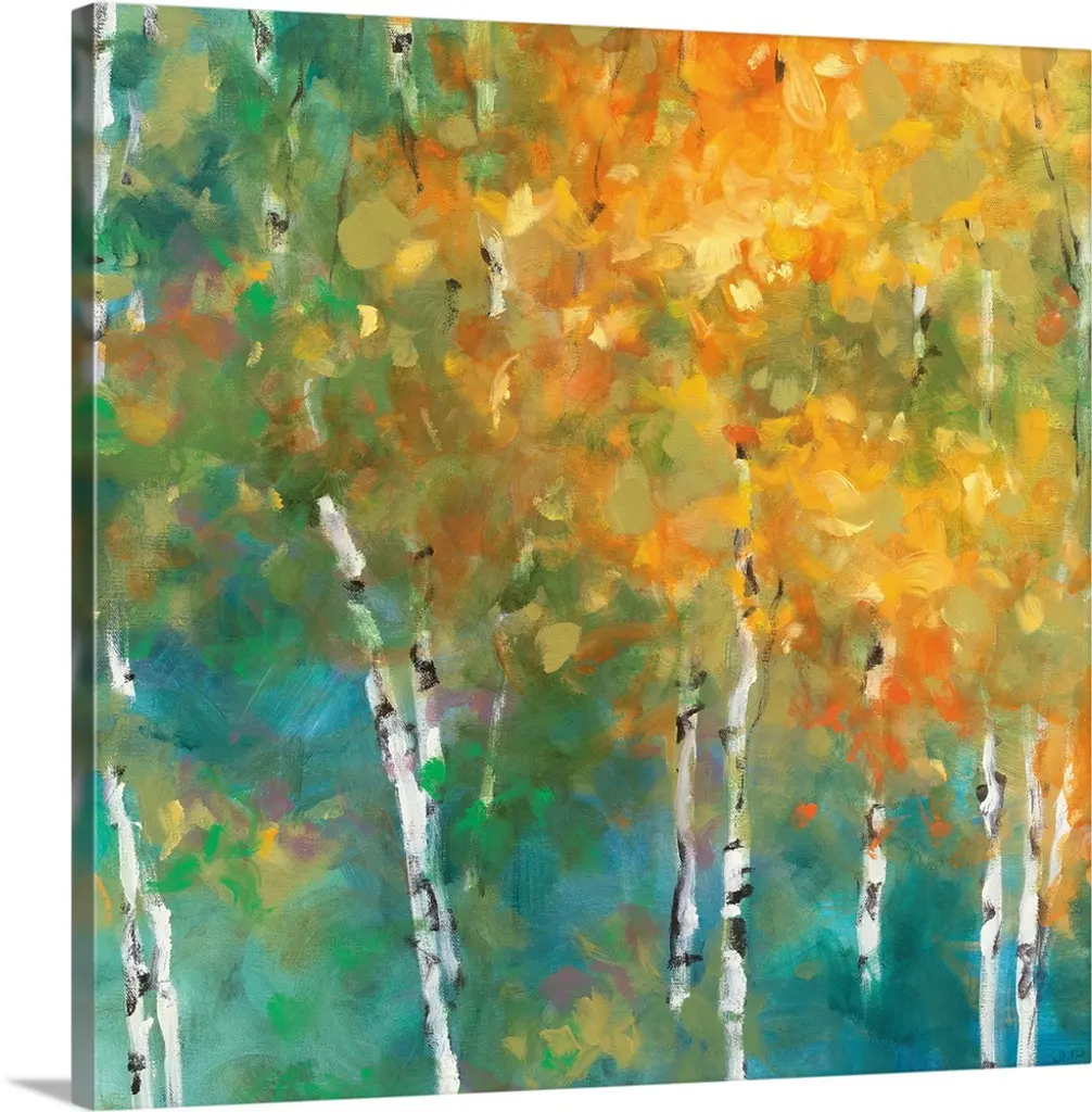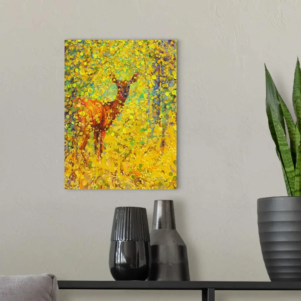 Brightly colored contemporary artwork of a deer in yellow trees.