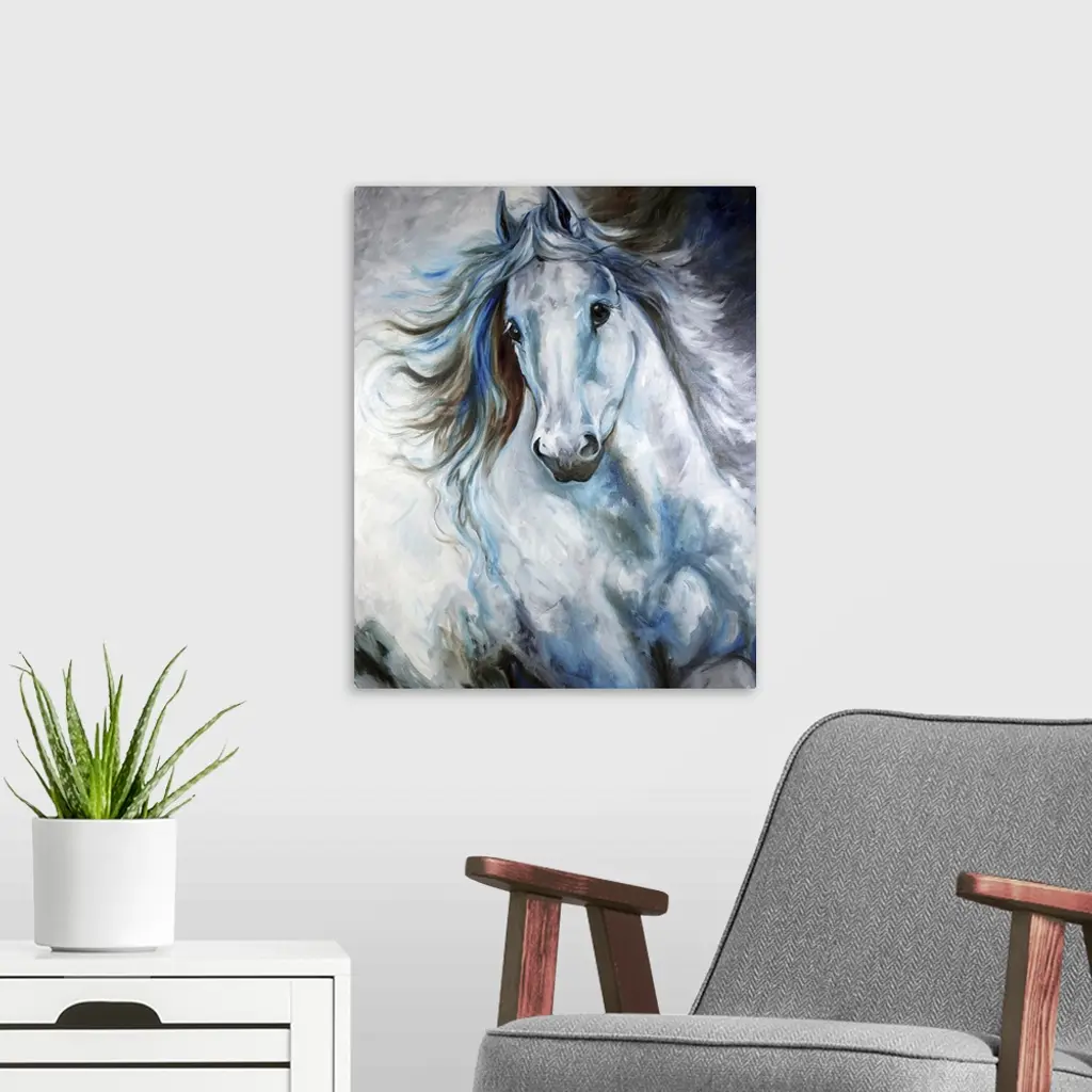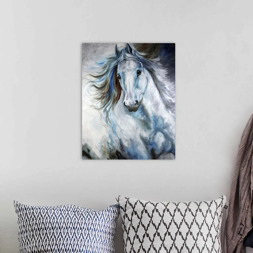 Contemporary painting of a cool-toned white, blue, and gray Arabian horse in action.