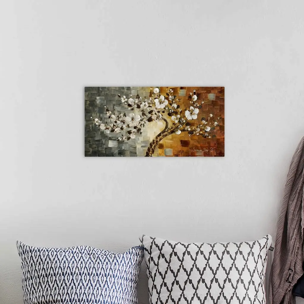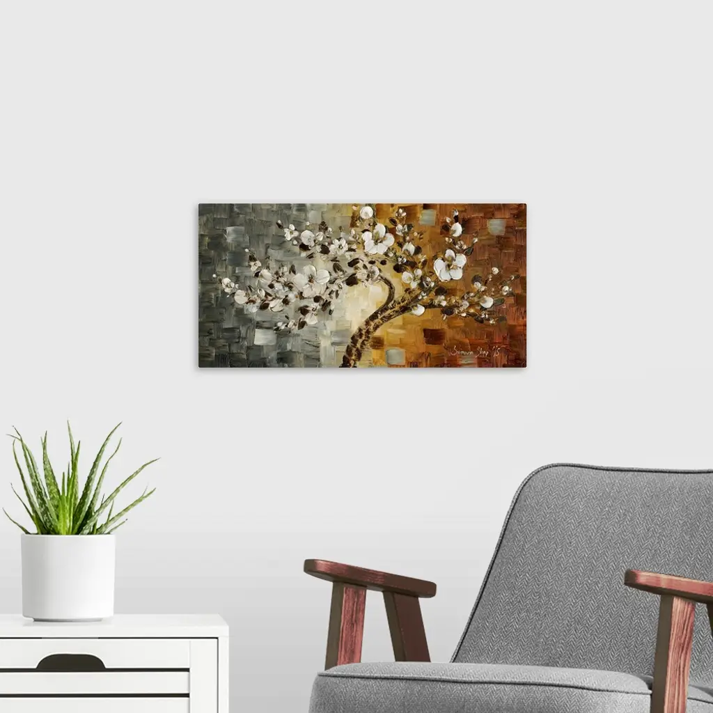 Contemporary painting of a white blossom cherry tree on a textured background created with gray, white, yellow, and bronze squares.