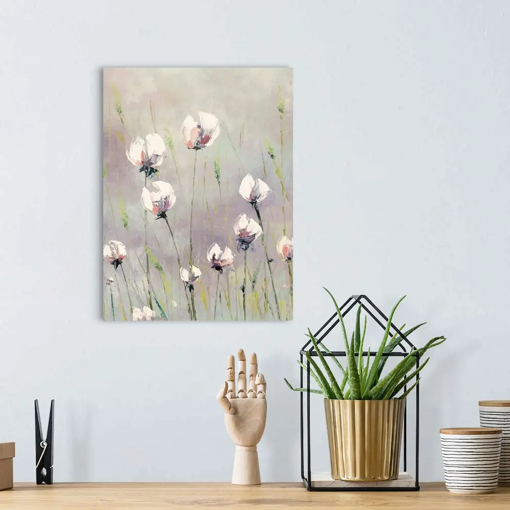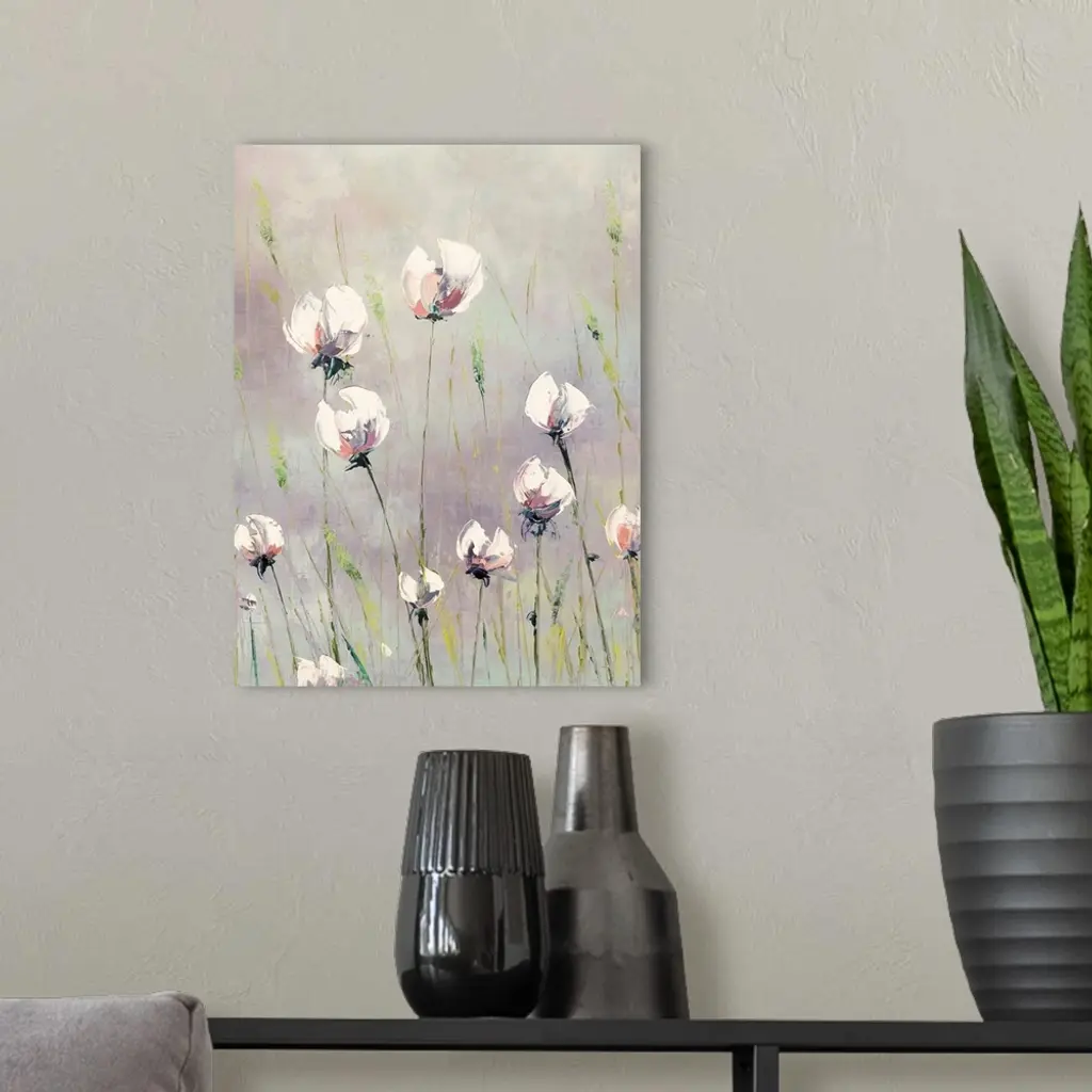 A light, contemporary painting of tall white flowers interspersed with green grasses on a neutral grey background