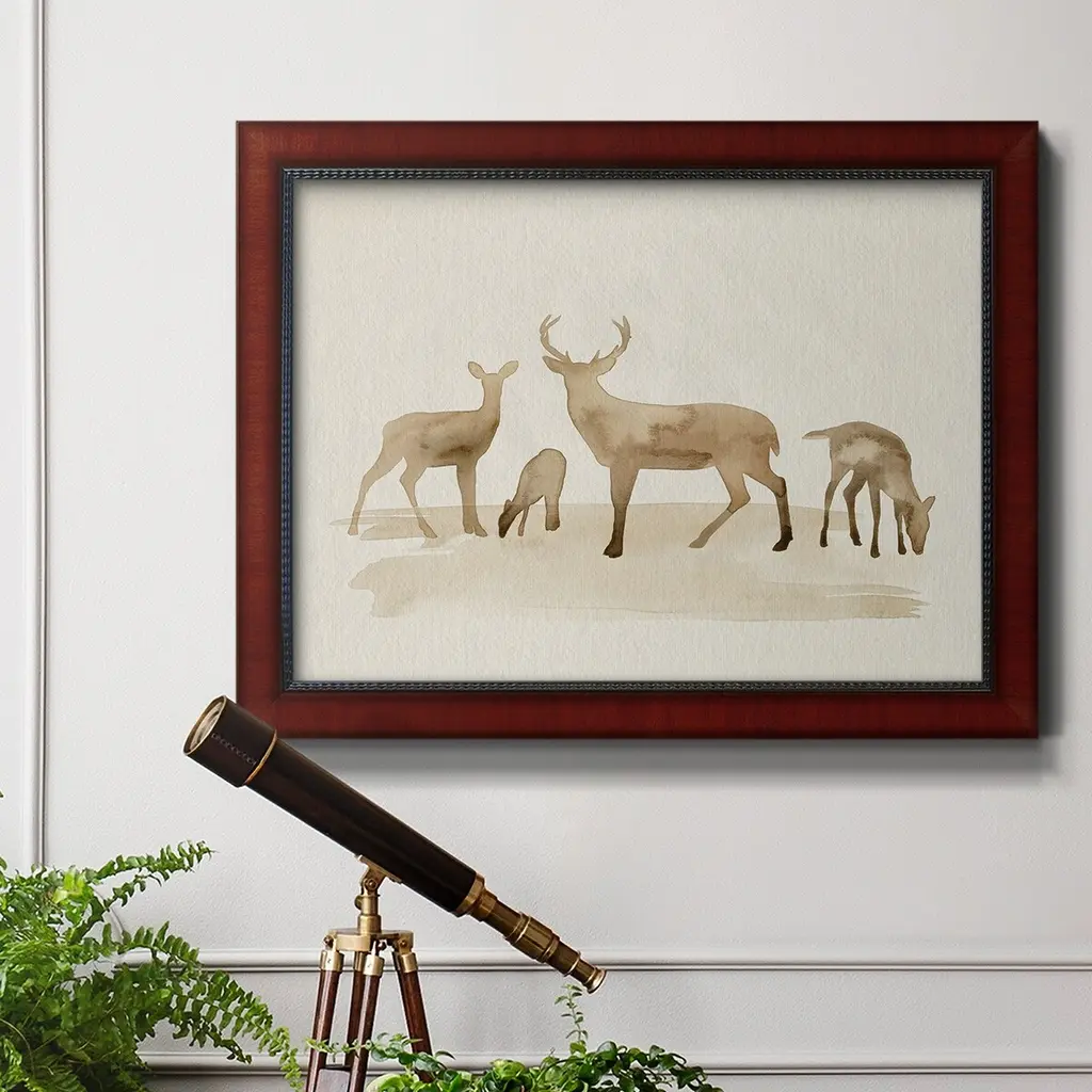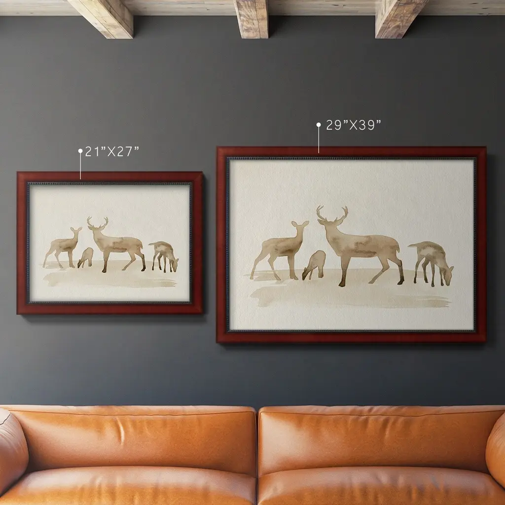 Whitetail Herd I Premium Framed Canvas- Ready to Hang A Premium Framed Canvas created to last. Framed in distressed wood and available in an array of sizes and colors Featuring a beveled a solid wood stretcher bar, each piece comes ready to hand 3 SIZES AVAILABLE 16''X20'' - Overall Size 18'X27'' - Overall Size 24''x36'' - Overall Size Each piece is made to order. Each piece comes with hanging hardware. Made in the USA Ready to Hang Giclee Paper Print Acrylic Glass Beveled Matt Board