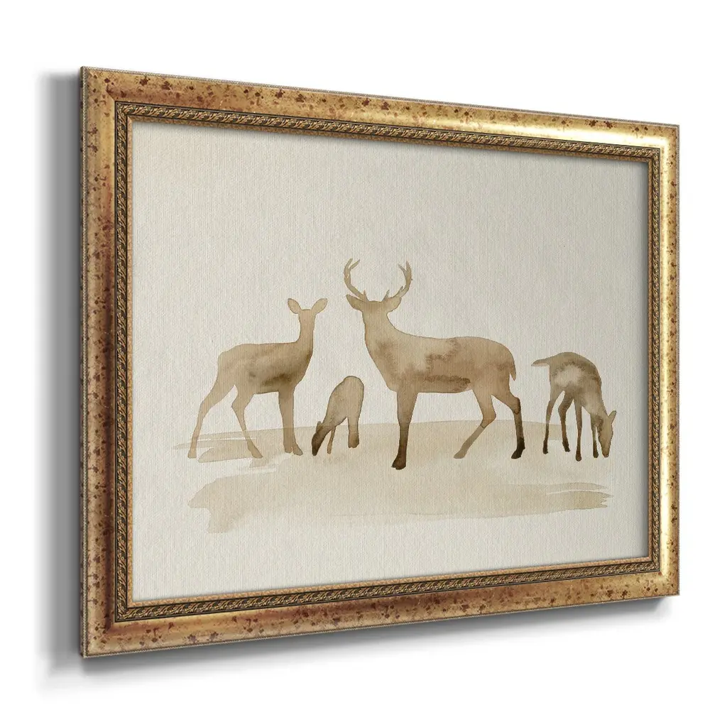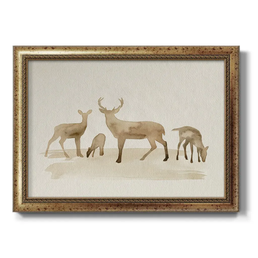 Whitetail Herd I Premium Framed Canvas- Ready to Hang A Premium Framed Canvas created to last. Framed in distressed wood and available in an array of sizes and colors Featuring a beveled a solid wood stretcher bar, each piece comes ready to hand 3 SIZES AVAILABLE 16''X20'' - Overall Size 18'X27'' - Overall Size 24''x36'' - Overall Size Each piece is made to order. Each piece comes with hanging hardware. Made in the USA Ready to Hang Giclee Paper Print Acrylic Glass Beveled Matt Board