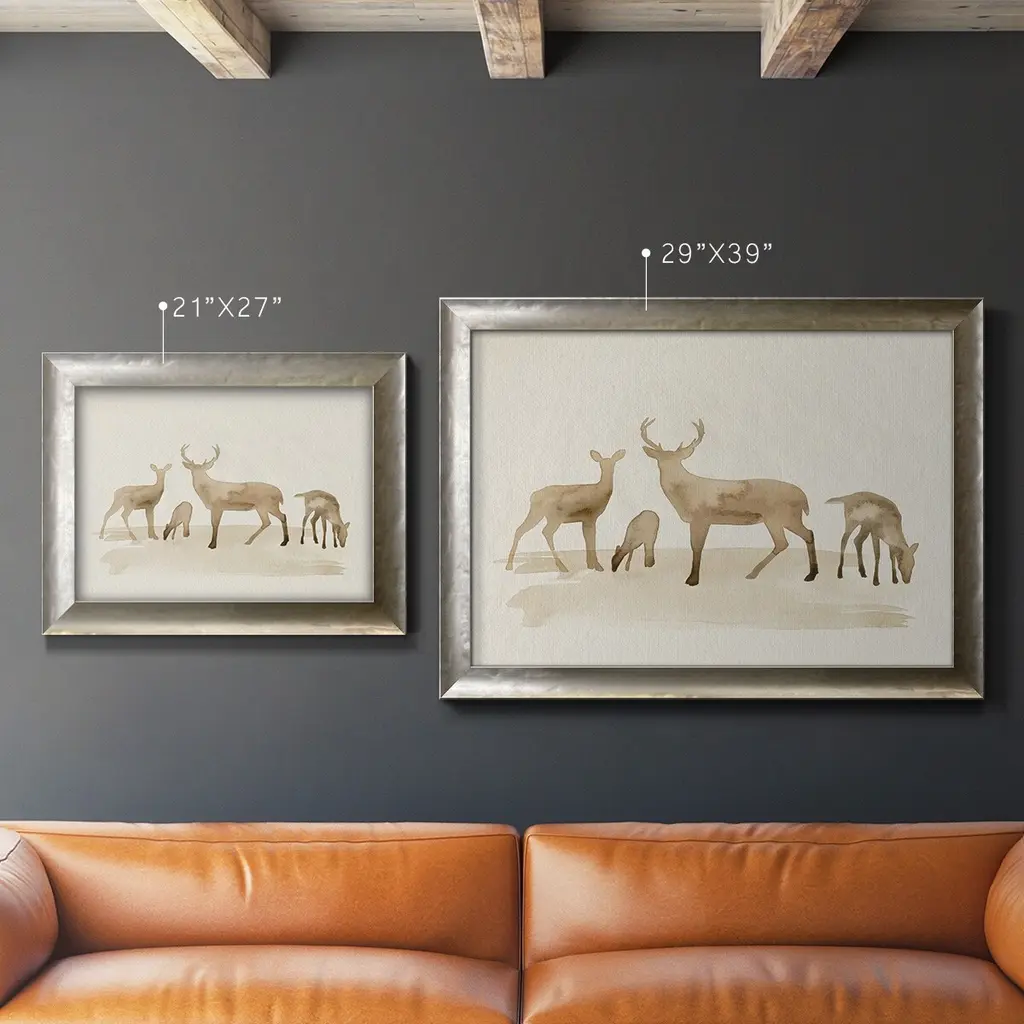 Whitetail Herd I Premium Framed Canvas- Ready to Hang A Premium Framed Canvas created to last. Framed in distressed wood and available in an array of sizes and colors Featuring a beveled a solid wood stretcher bar, each piece comes ready to hand 3 SIZES AVAILABLE 16''X20'' - Overall Size 18'X27'' - Overall Size 24''x36'' - Overall Size Each piece is made to order. Each piece comes with hanging hardware. Made in the USA Ready to Hang Giclee Paper Print Acrylic Glass Beveled Matt Board