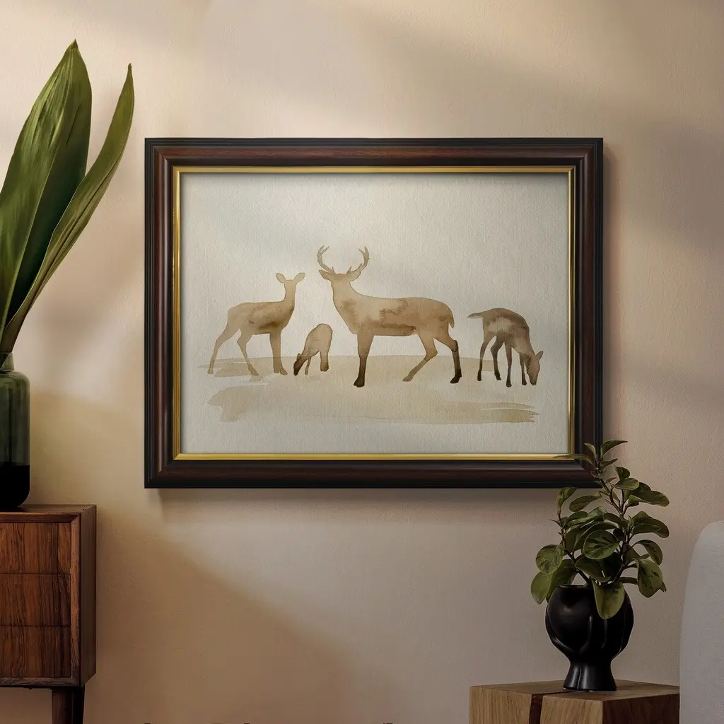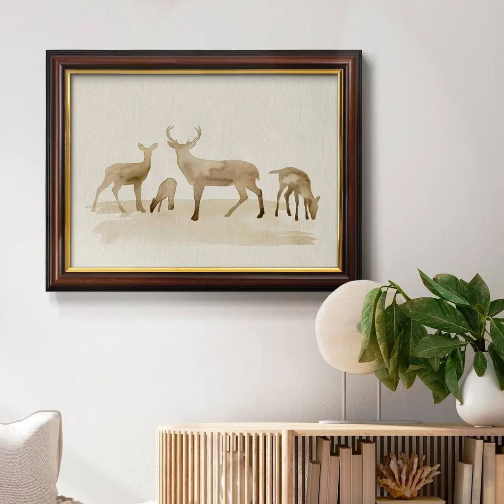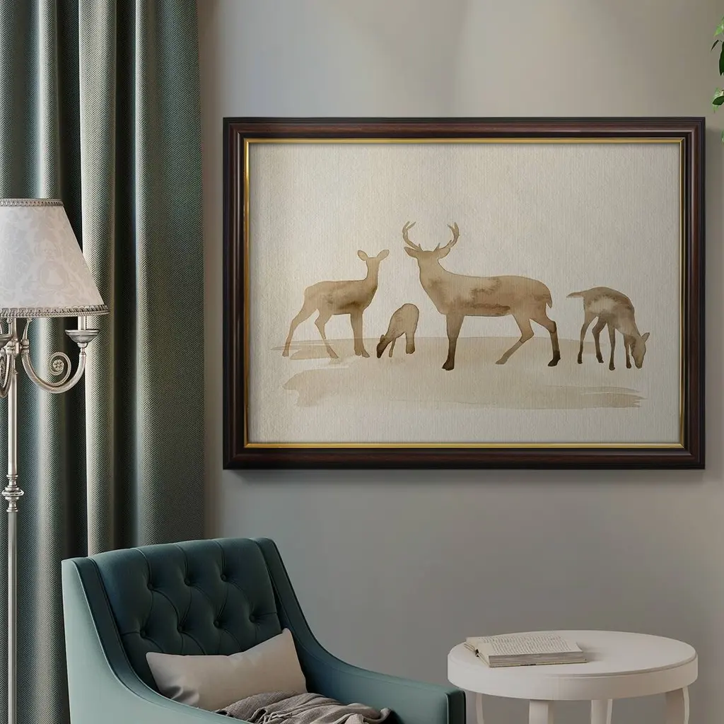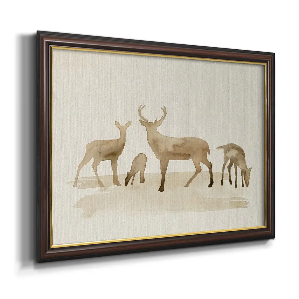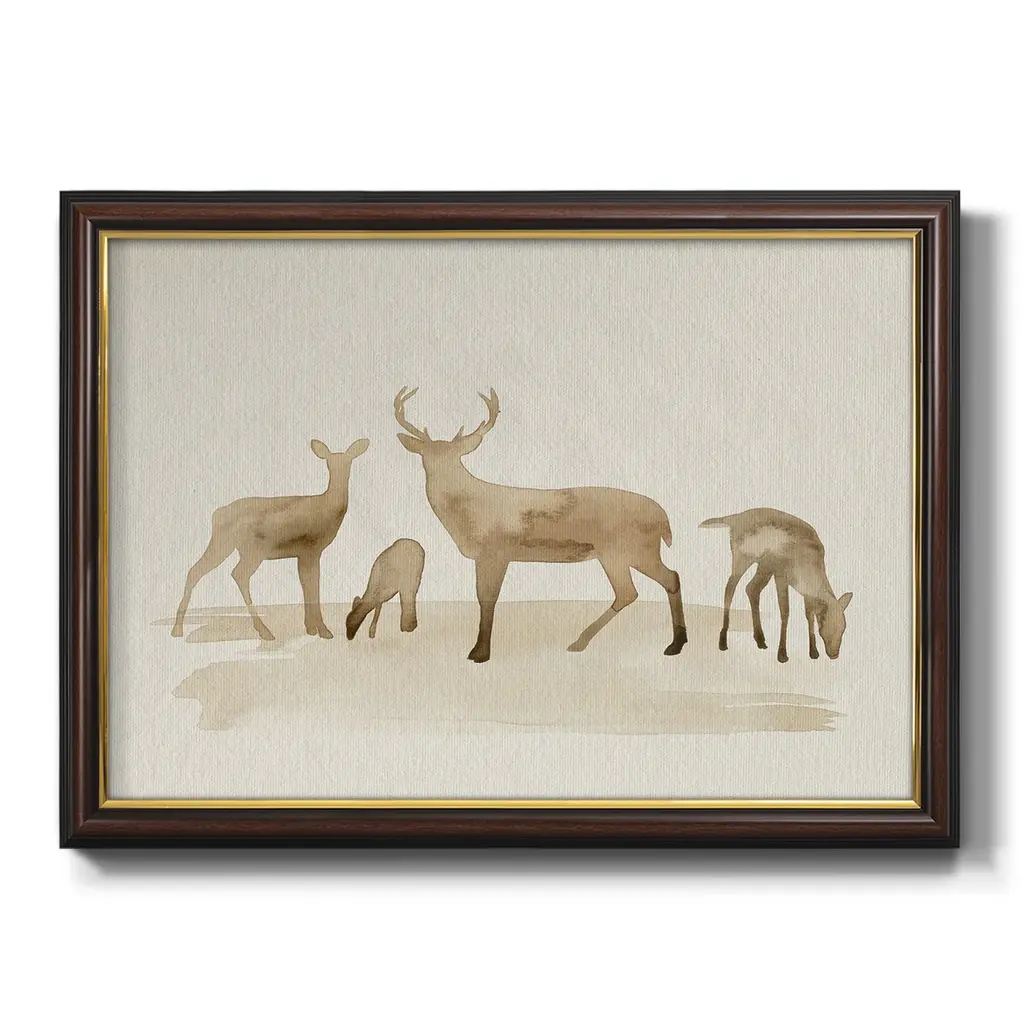Whitetail Herd I Premium Framed Canvas- Ready to Hang A Premium Framed Canvas created to last. Framed in distressed wood and available in an array of sizes and colors Featuring a beveled a solid wood stretcher bar, each piece comes ready to hand 3 SIZES AVAILABLE 16''X20'' - Overall Size 18'X27'' - Overall Size 24''x36'' - Overall Size Each piece is made to order. Each piece comes with hanging hardware. Made in the USA Ready to Hang Giclee Paper Print Acrylic Glass Beveled Matt Board