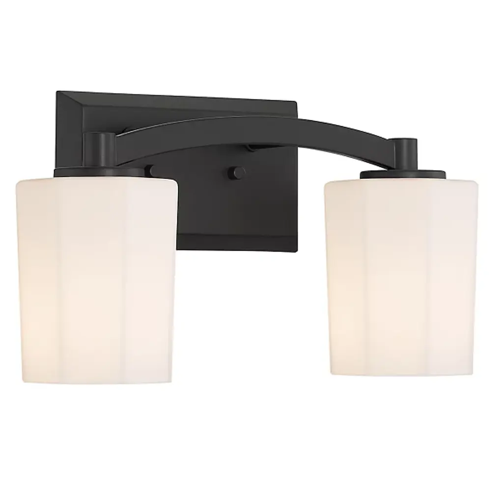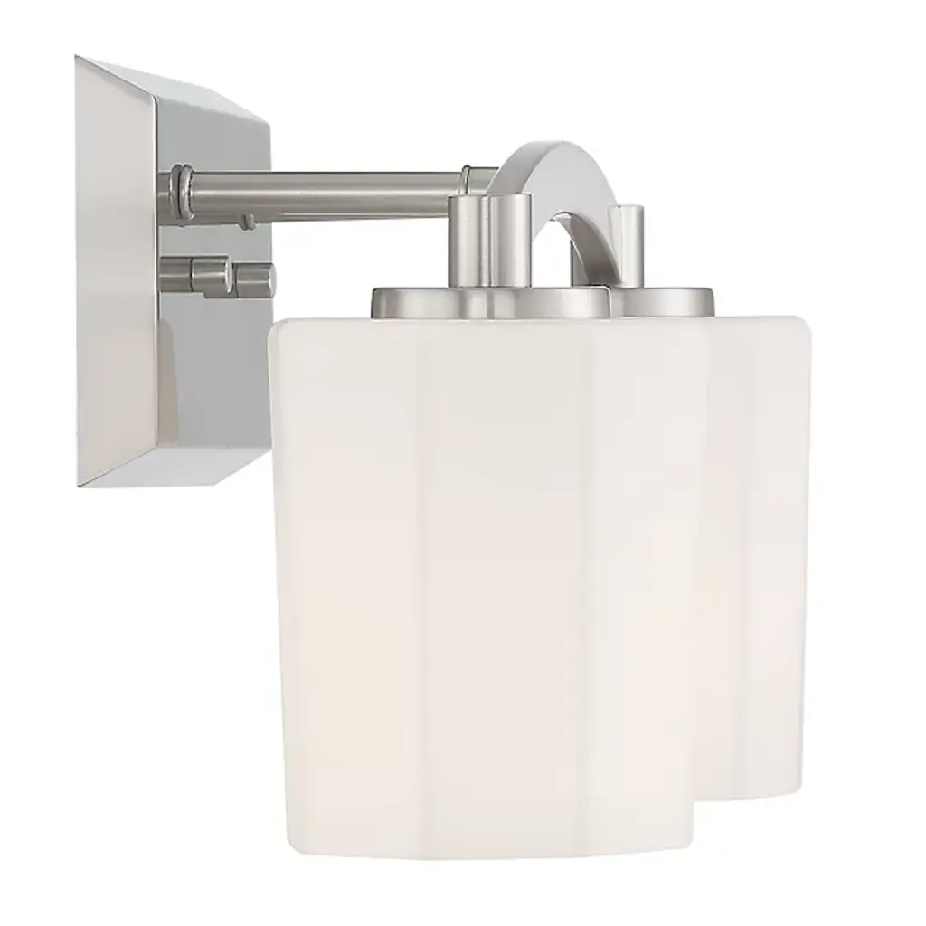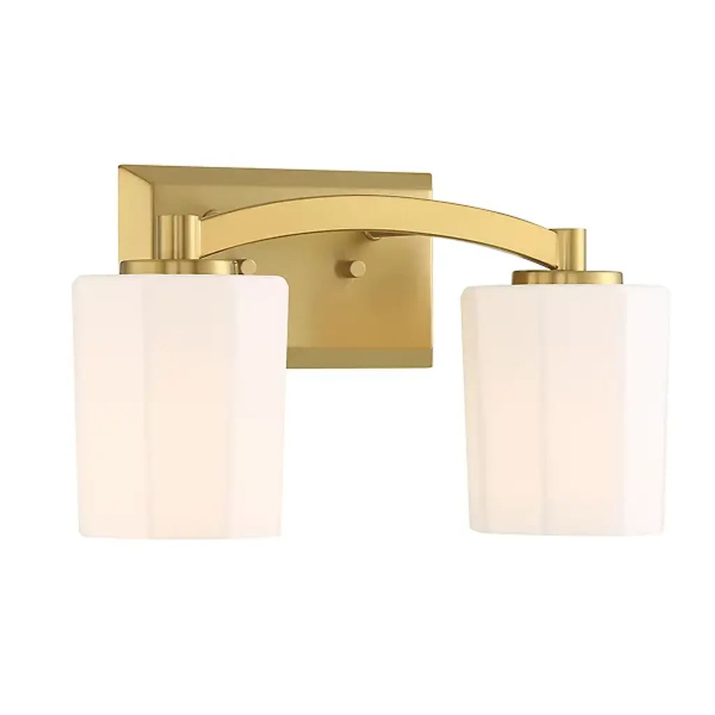 Create an enchanting ambiance that transforms any space into a sanctuary of sophistication with the Whitney Vanity Light from Savoy House. An inspired design that pairs vintage glam and timeless charm, it extends from a bevel-edged rectangular wall plate, while opal etched glass fluted shades mellow bright light to cast a flattering and inviting glow. The curving arm lends intrigue to the stark metal planes of the wall mount, while the warm metal finish ensures a sleek elegance.