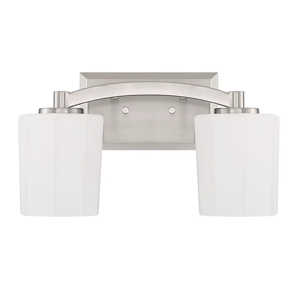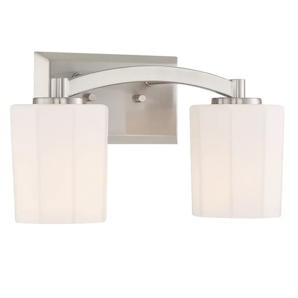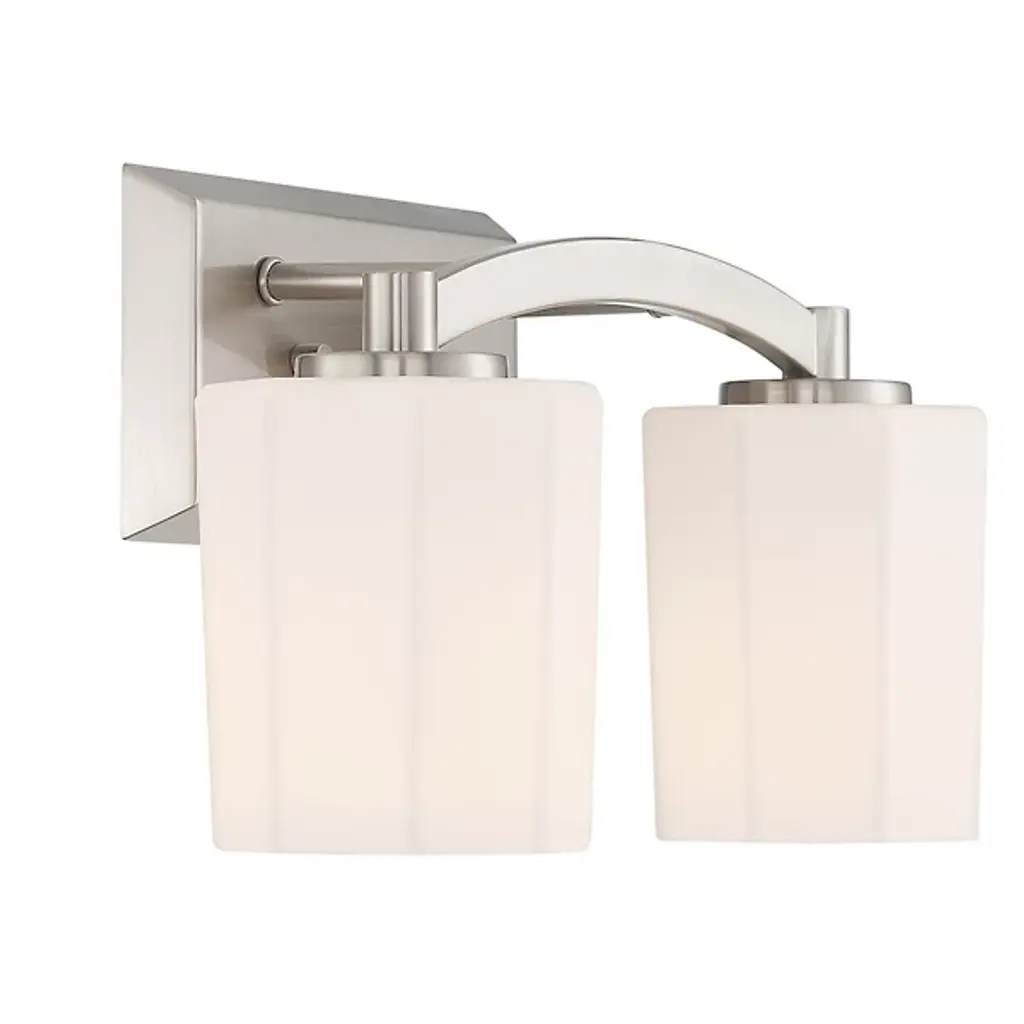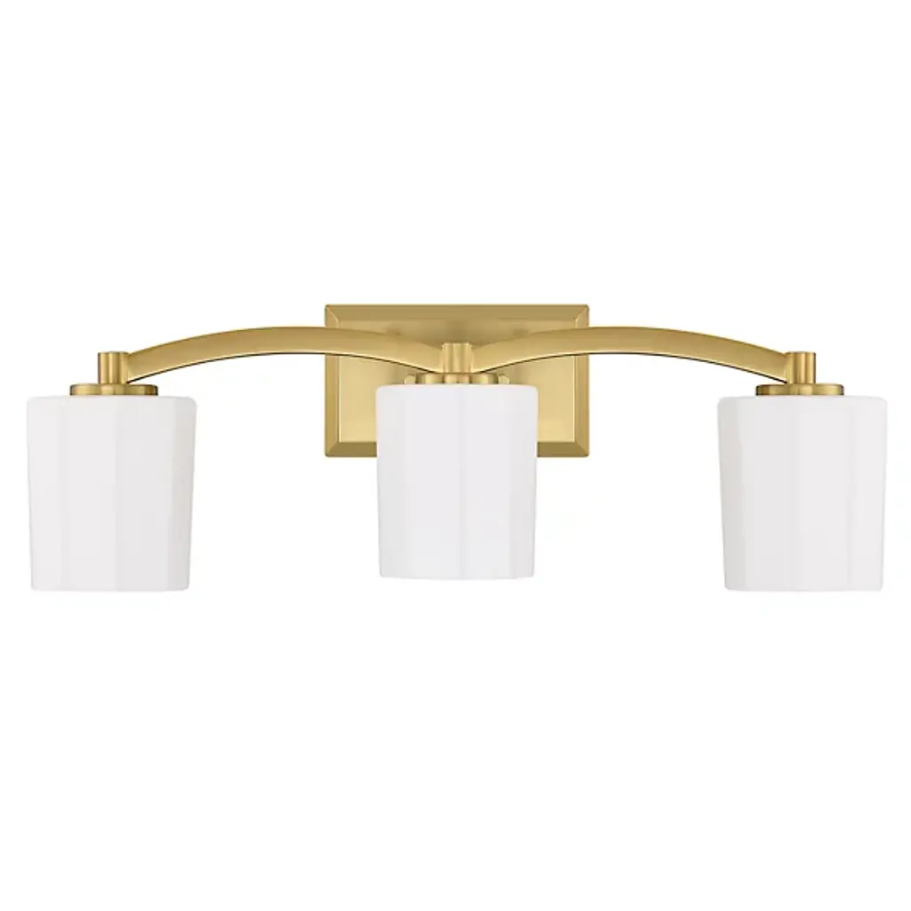 Create an enchanting ambiance that transforms any space into a sanctuary of sophistication with the Whitney Vanity Light from Savoy House. An inspired design that pairs vintage glam and timeless charm, it extends from a bevel-edged rectangular wall plate, while opal etched glass fluted shades mellow bright light to cast a flattering and inviting glow. The curving arm lends intrigue to the stark metal planes of the wall mount, while the warm metal finish ensures a sleek elegance.