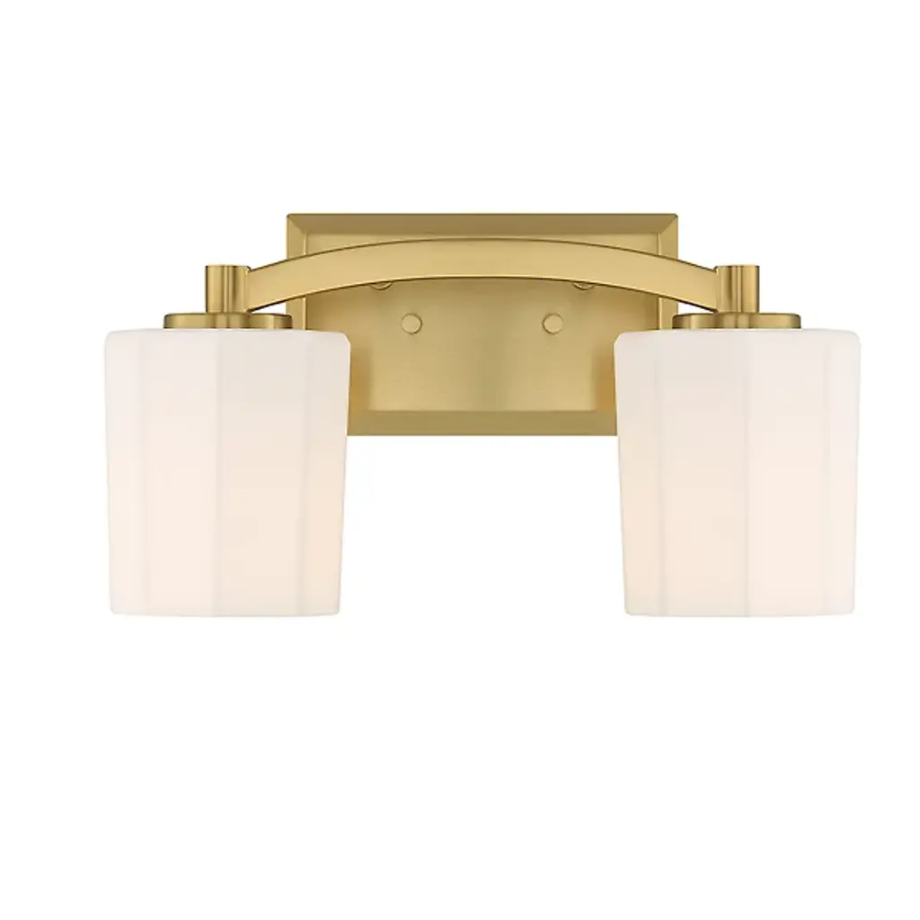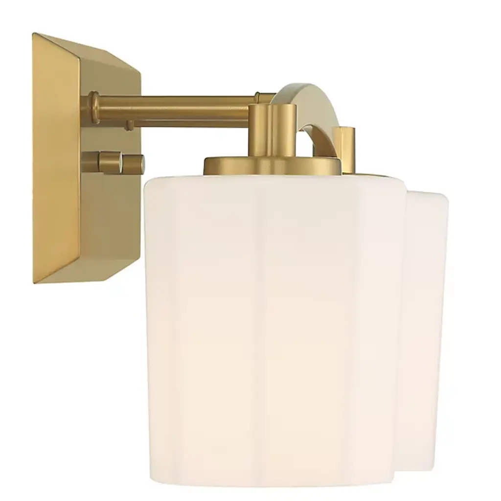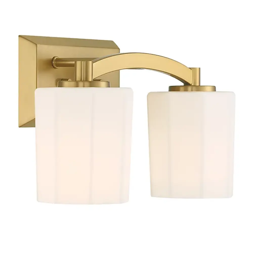 Create an enchanting ambiance that transforms any space into a sanctuary of sophistication with the Whitney Vanity Light from Savoy House. An inspired design that pairs vintage glam and timeless charm, it extends from a bevel-edged rectangular wall plate, while opal etched glass fluted shades mellow bright light to cast a flattering and inviting glow. The curving arm lends intrigue to the stark metal planes of the wall mount, while the warm metal finish ensures a sleek elegance.