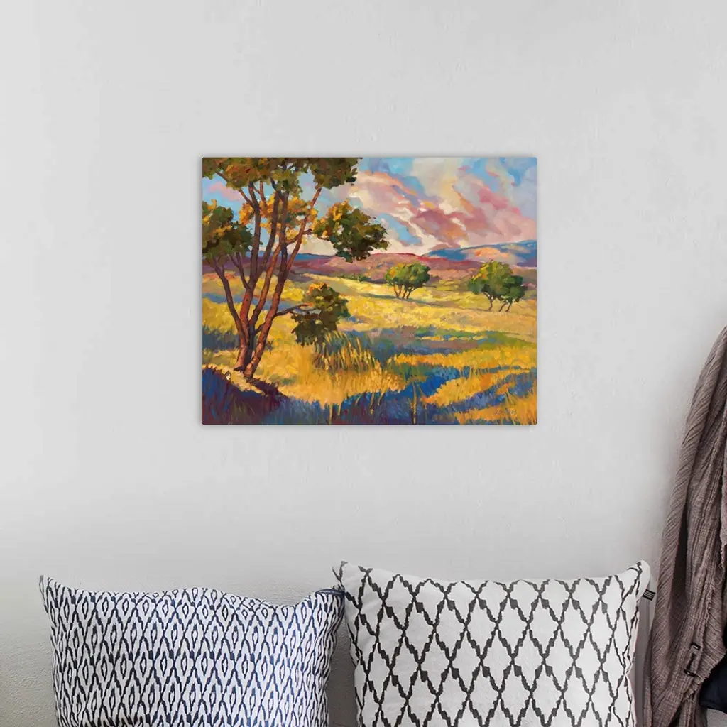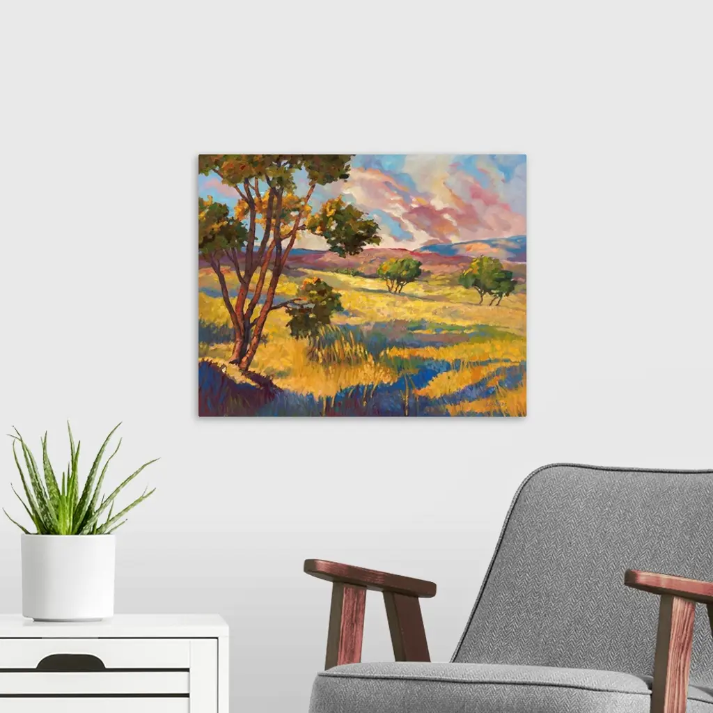 Contemporary landscape painting of trees in rolling yellow fields at sunset.