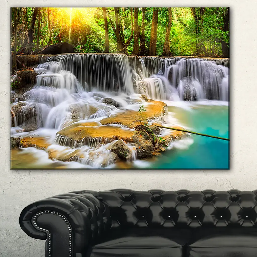 The Wide View of Erawan Waterfall canvas art print is sure to make an impression on anyone who sees it. This artwork is gallery wrapped around a 1-inch solid wood frame and arrives carefully packaged and entirely ready to hang on the wall. Design Art only uses the highest resolution and pigments to ensure a crisp colorful print that is never faded or pixelated. This artwork is sure to be a conversation starter in any home or office.