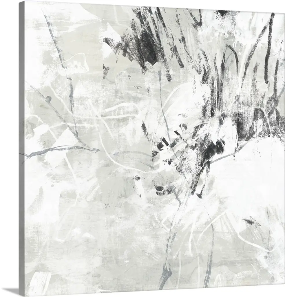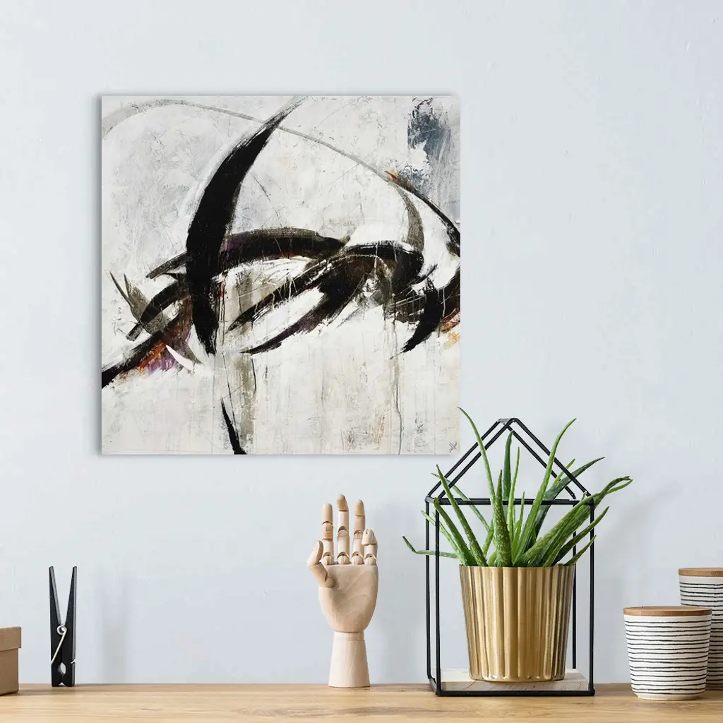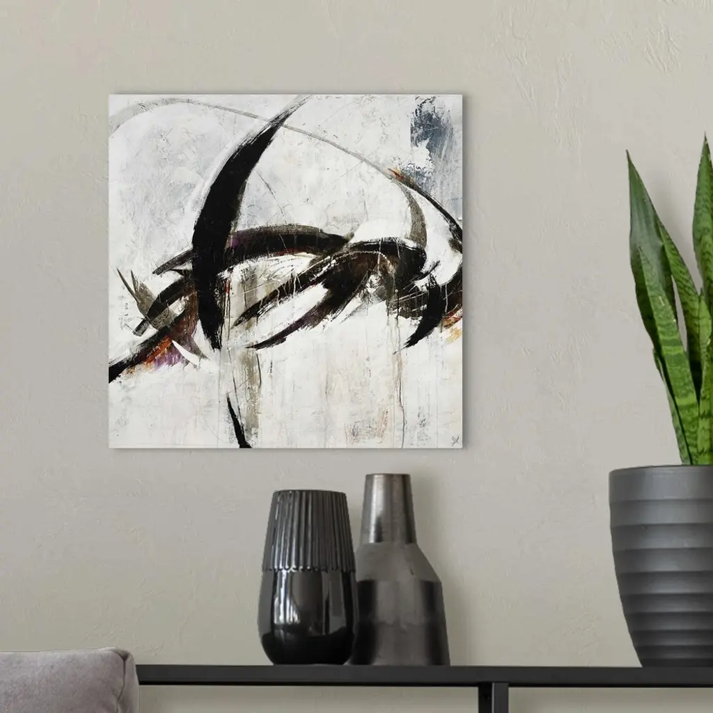 Abstract painting using harsh black paint strokes against a neutral background.