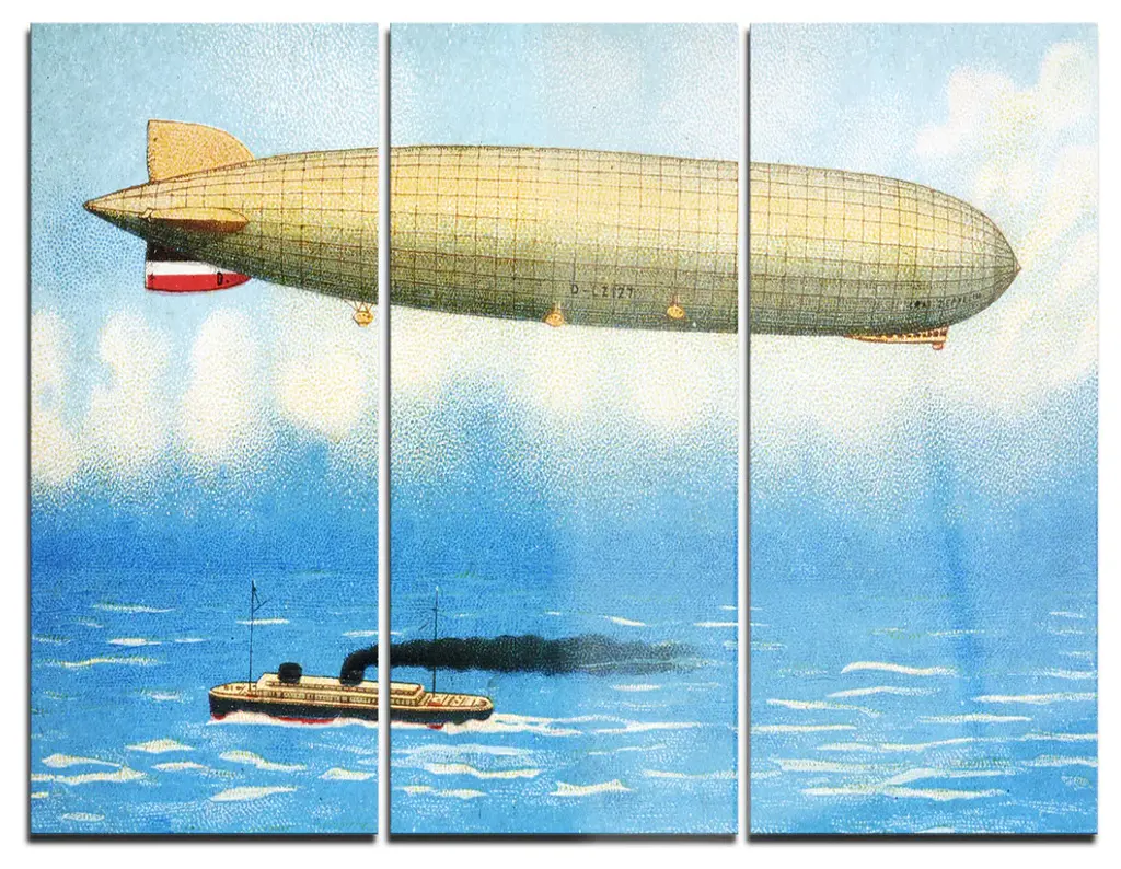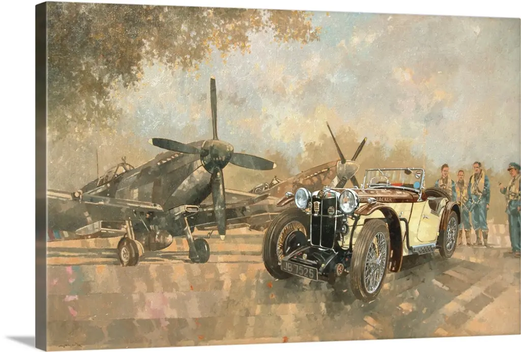 Big, vertical, vintage wall hanging of Wilbur Wright Aviation. A group of people look upward at a biplane in the sky, as the sun sets.