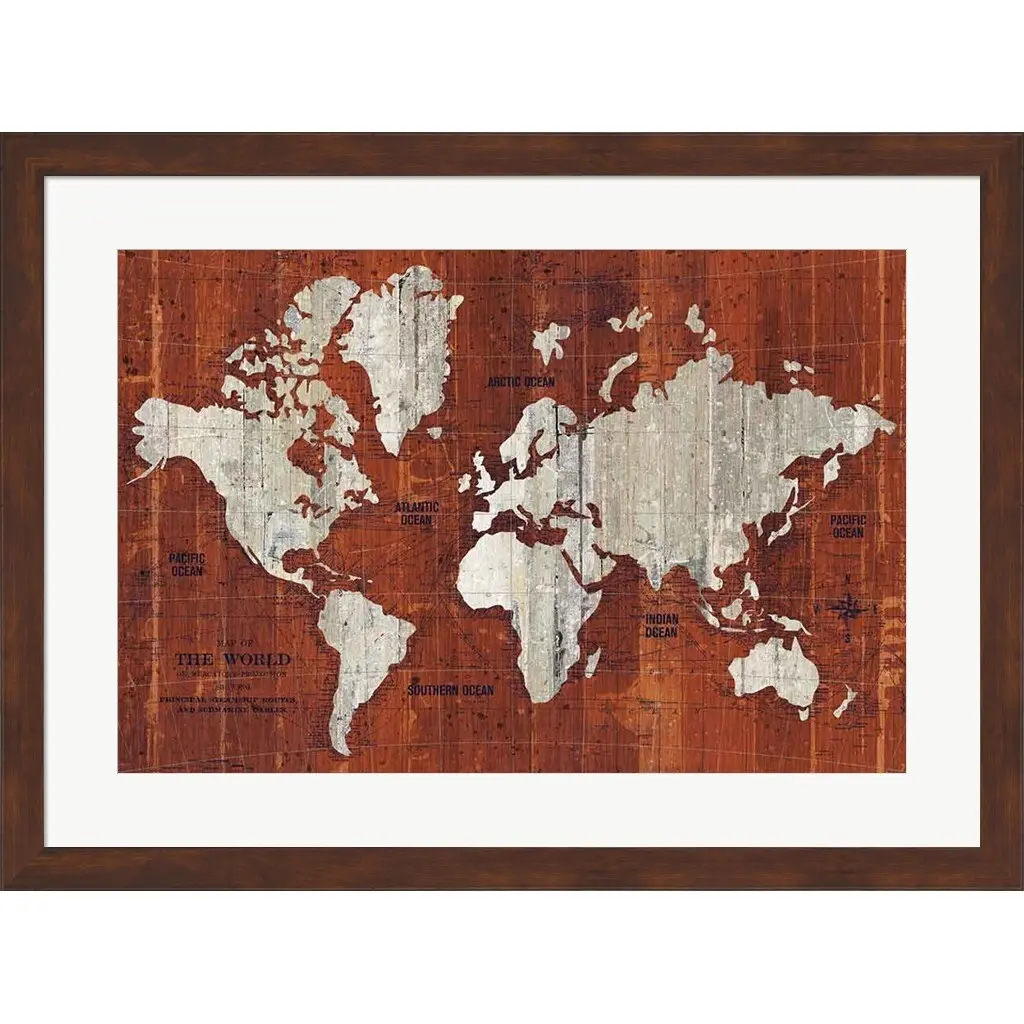 Old World Map Rust by Wild Apple Portfolio is a high quality piece of framed artwork. The finished size of this piece is 30.5" X 22.75". It has a Slim Solid Pecan Brown Flat with Satin Finish frame, is single matted and finished with high quality Acrylic Plexiglass. 100% Satisfaction Guaranteed.