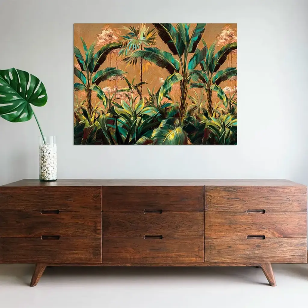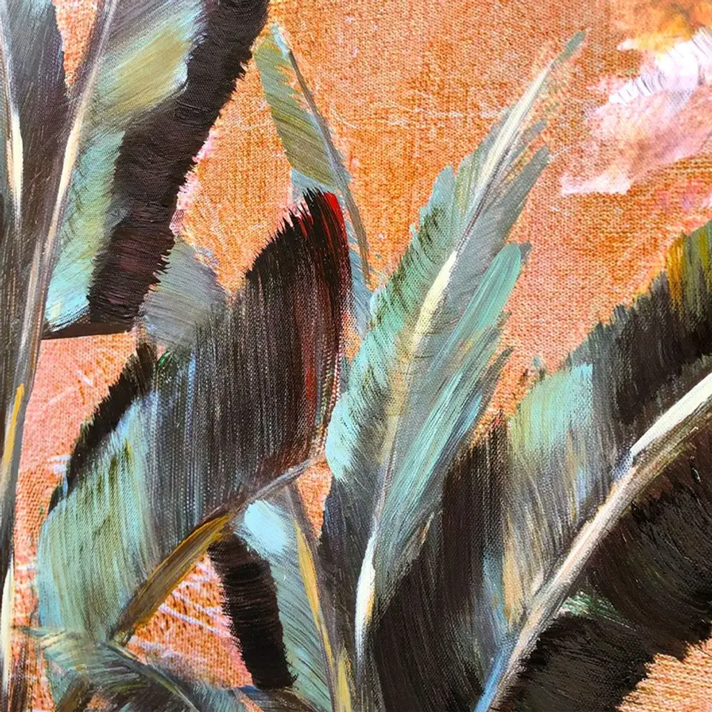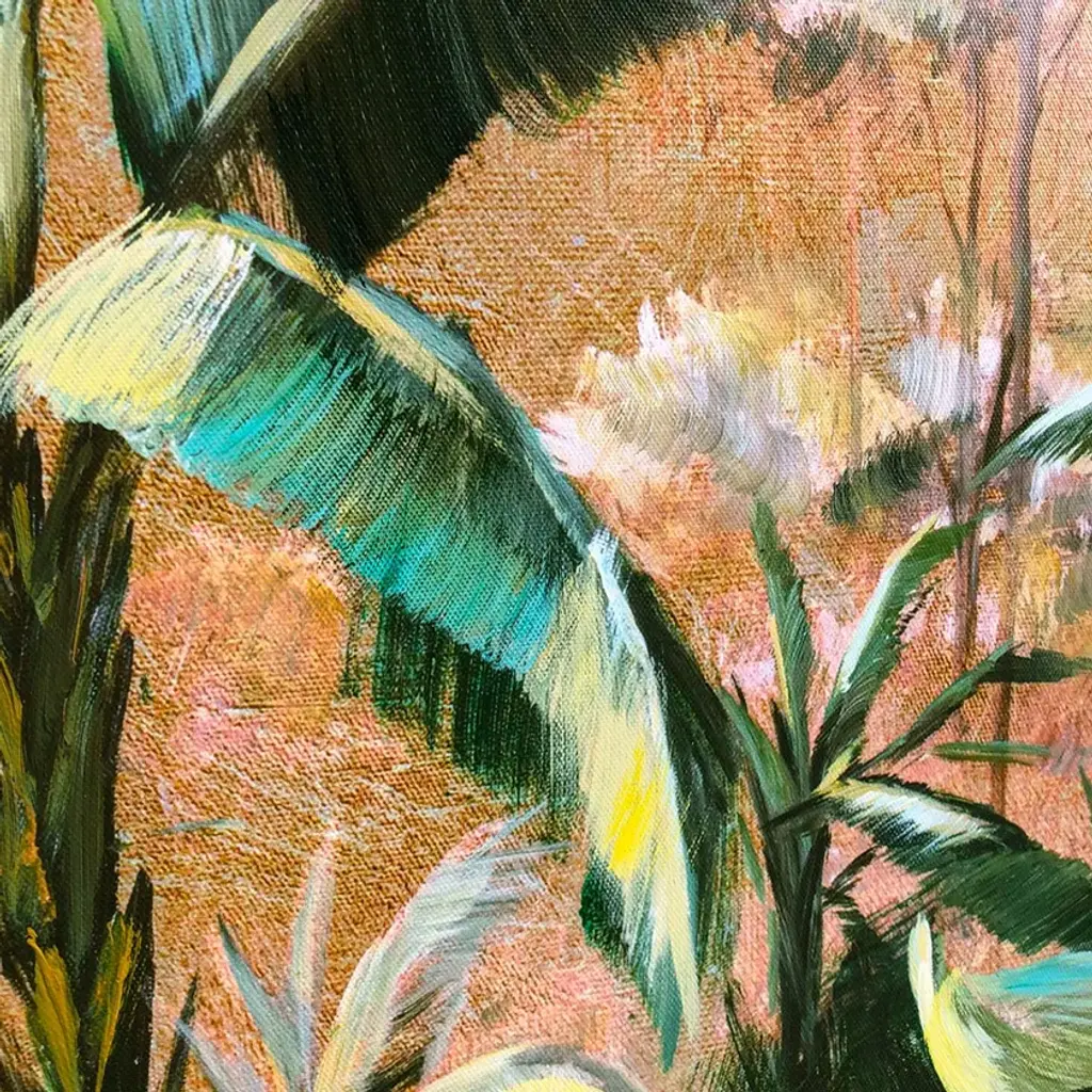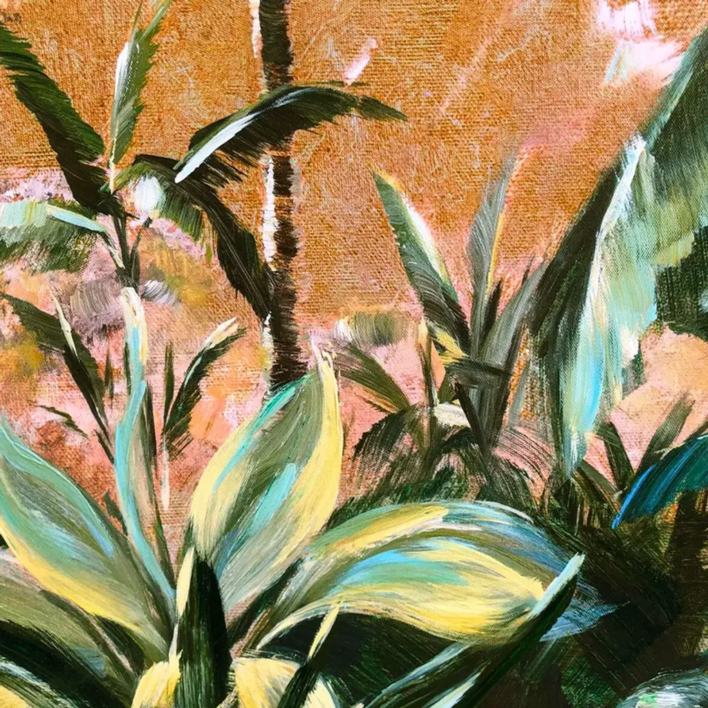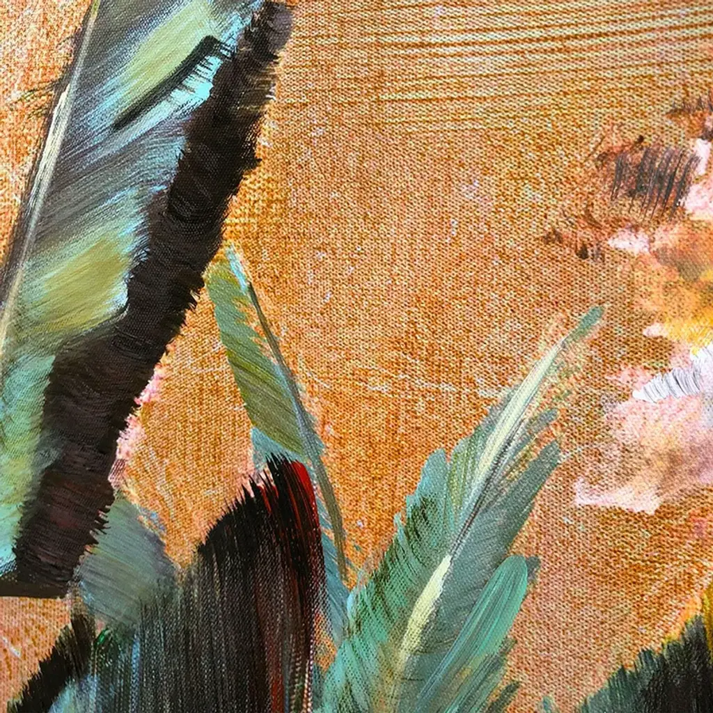 Wild is a hand-painted nature painting on canvas. The warm color palette of tropical plants depicted lends an exotic touch to the setting. With a wooden inner frame and painted edges, the painting is ready to hang.The AGAVE Quadri collection represents the excellence of contemporary art applied to the world of interior design. Each piece, hand-painted with artisanal techniques by the finest artists in collaboration with the Italian company AGAVE, combines abstract, natural, and figurative elements to create unique and refined works. These paintings transform spaces into environments of great elegance and character, perfect for interior design projects that require a distinctive and artistic touch.