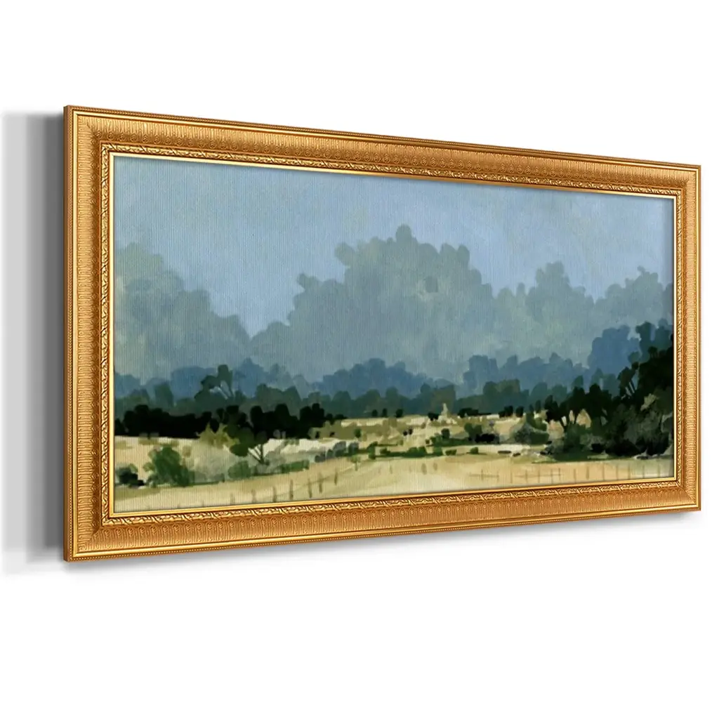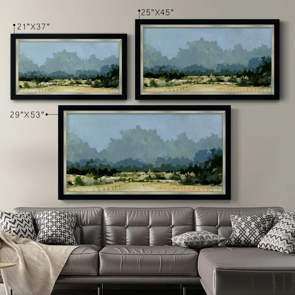 Wild Farmland I Premium Framed Canvas- Ready to Hang A Premium Framed Canvas created to last. Framed in distressed wood and available in an array of sizes and colors Featuring a beveled a solid wood stretcher bar, each piece comes ready to hand 3 SIZES AVAILABLE 21''X37'' - Overall Size 25''X45'' - Overall Size 29''x53'' - Overall Size Each piece is made to order. Each piece comes with hanging hardware. Made in the USA Ready to Hang Giclee Paper Print Acrylic Glass Beveled Matt Board