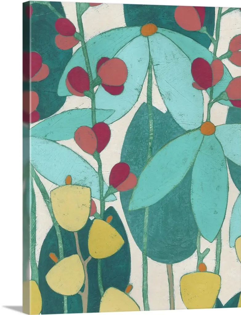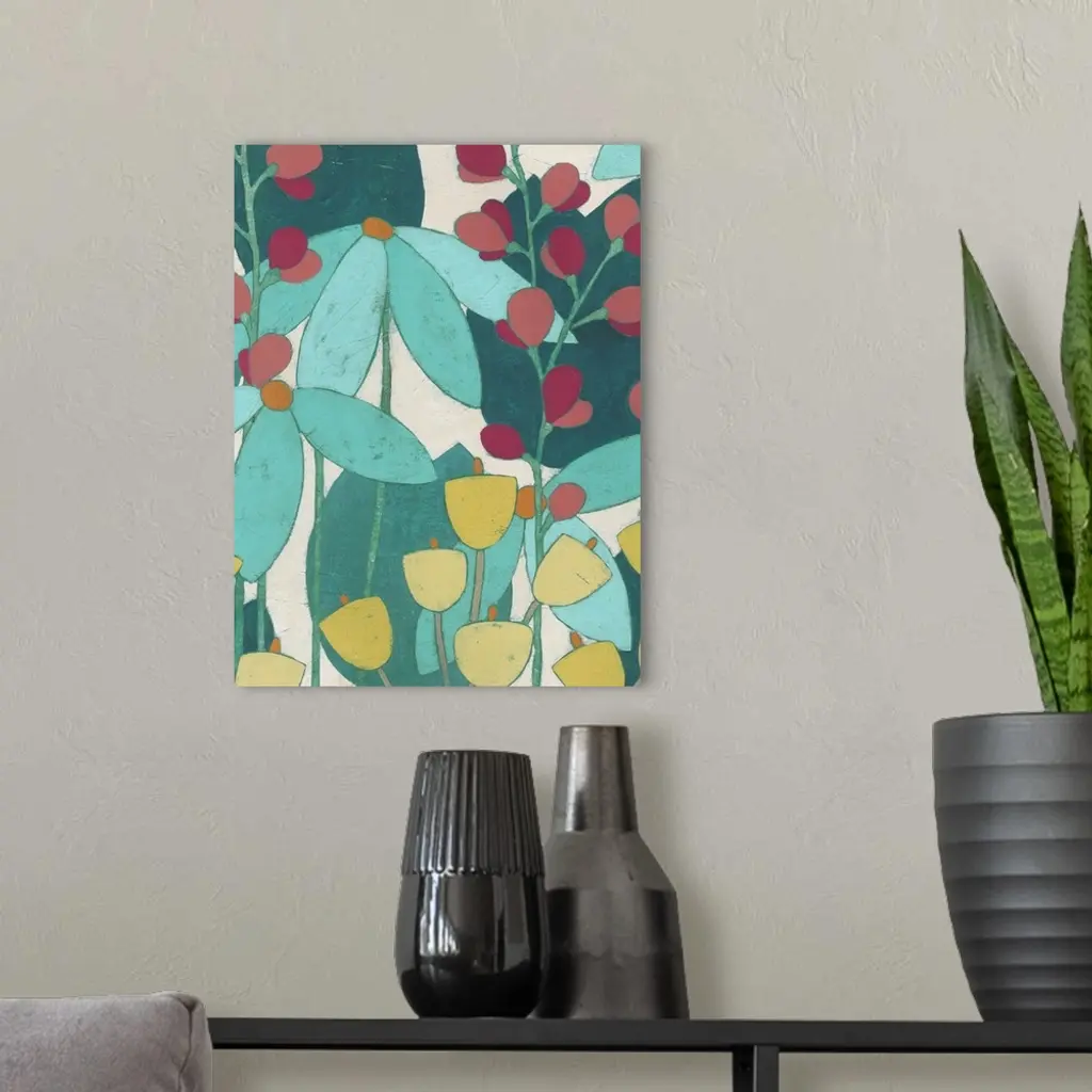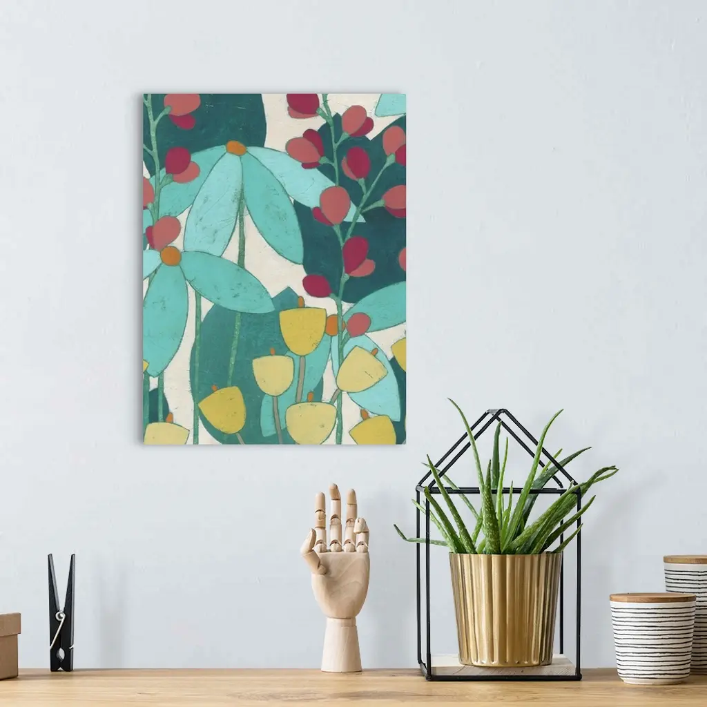 Contemporary painting of flower in teal and turquoise with small pale yellow flowers.
