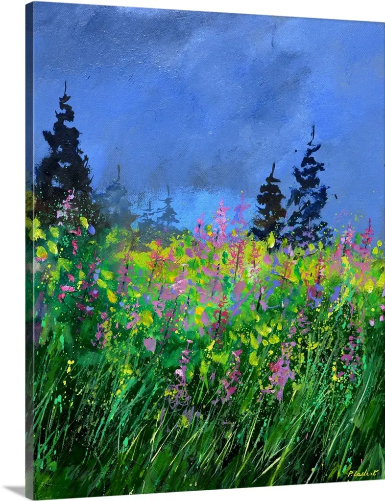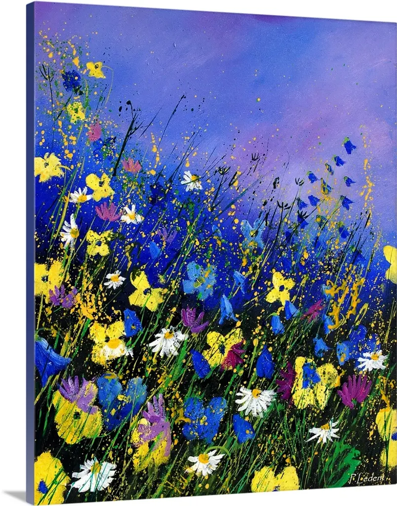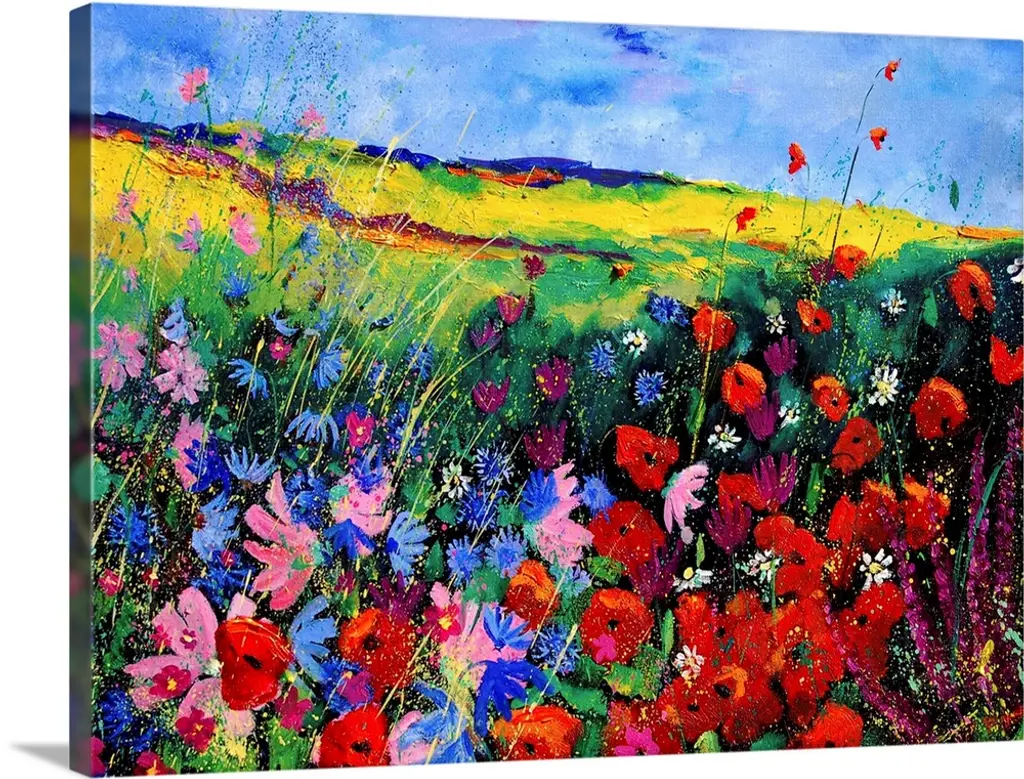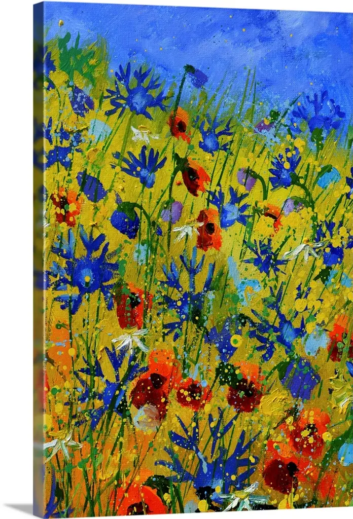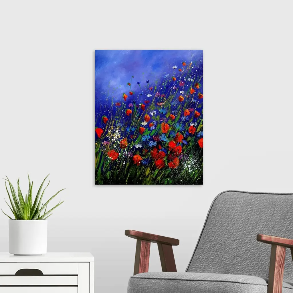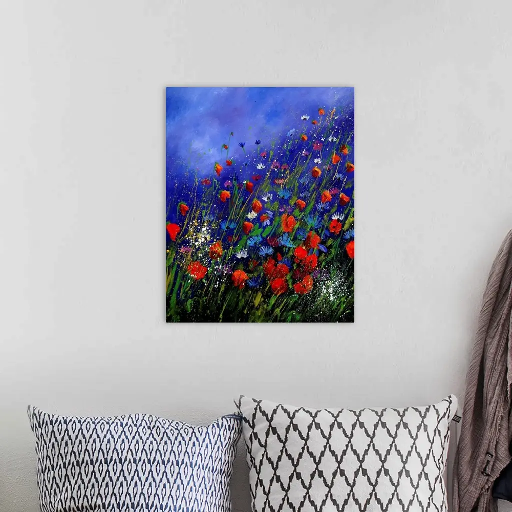 Vertical painting of a field of red and blue wild flowers in bloom with a vibrant blue sky.