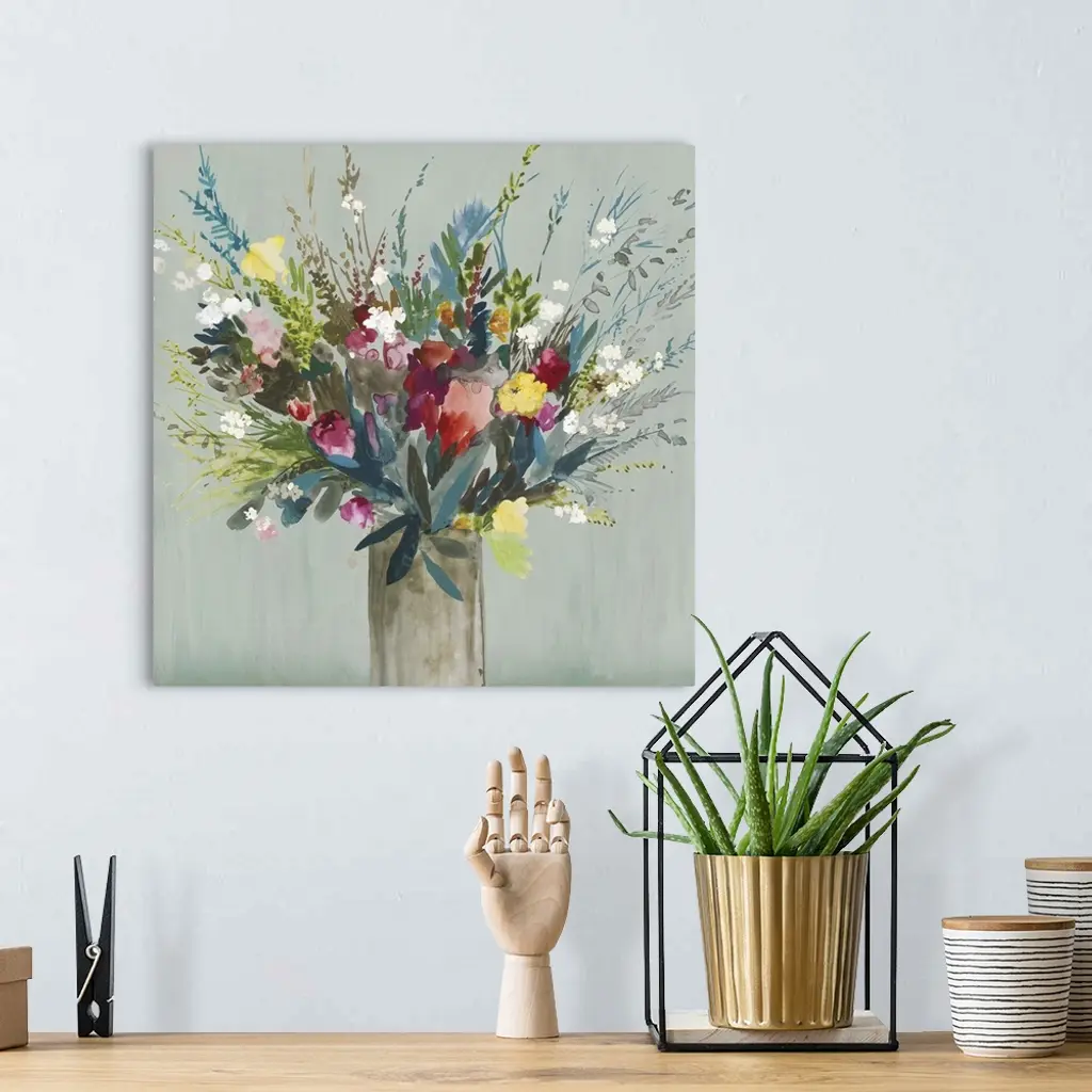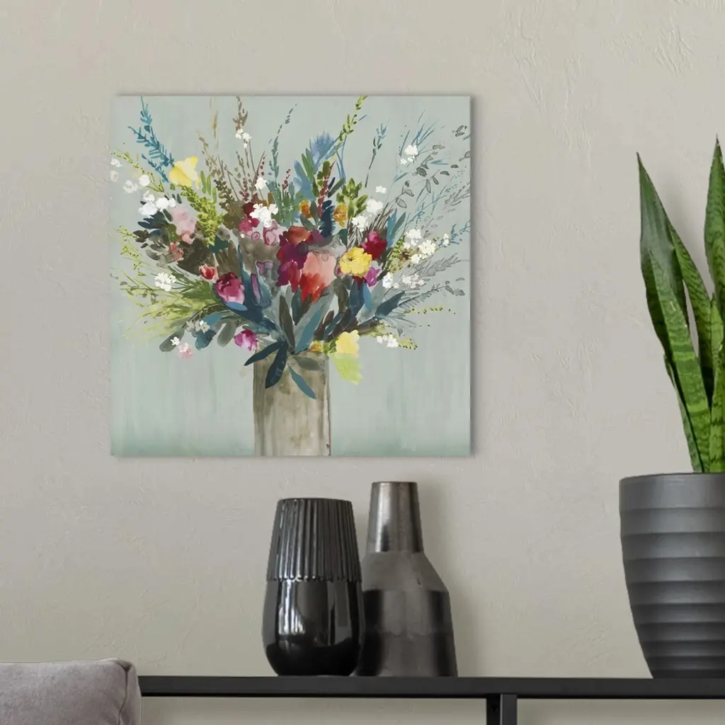 Contemporary artwork of a vase of brilliantly colored flowers and leaves.