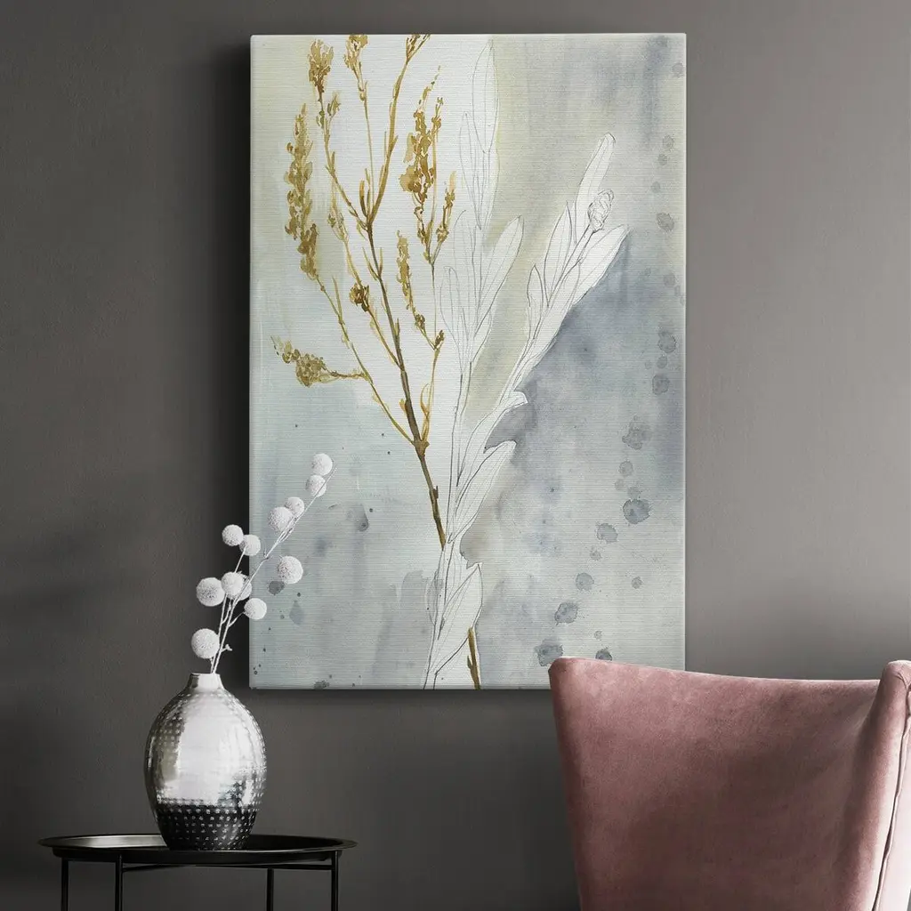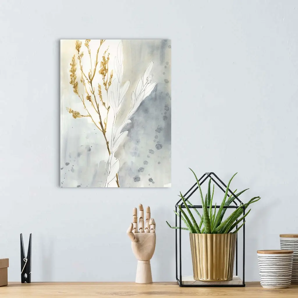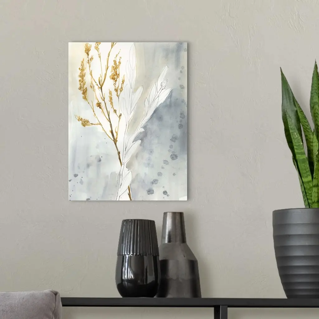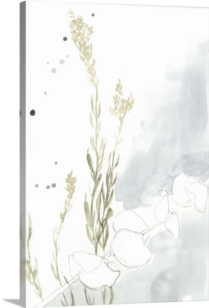 This contemporary artwork features gestural sketches and soft watercolors to illustrate stalks of grasses against a soft gradated background.