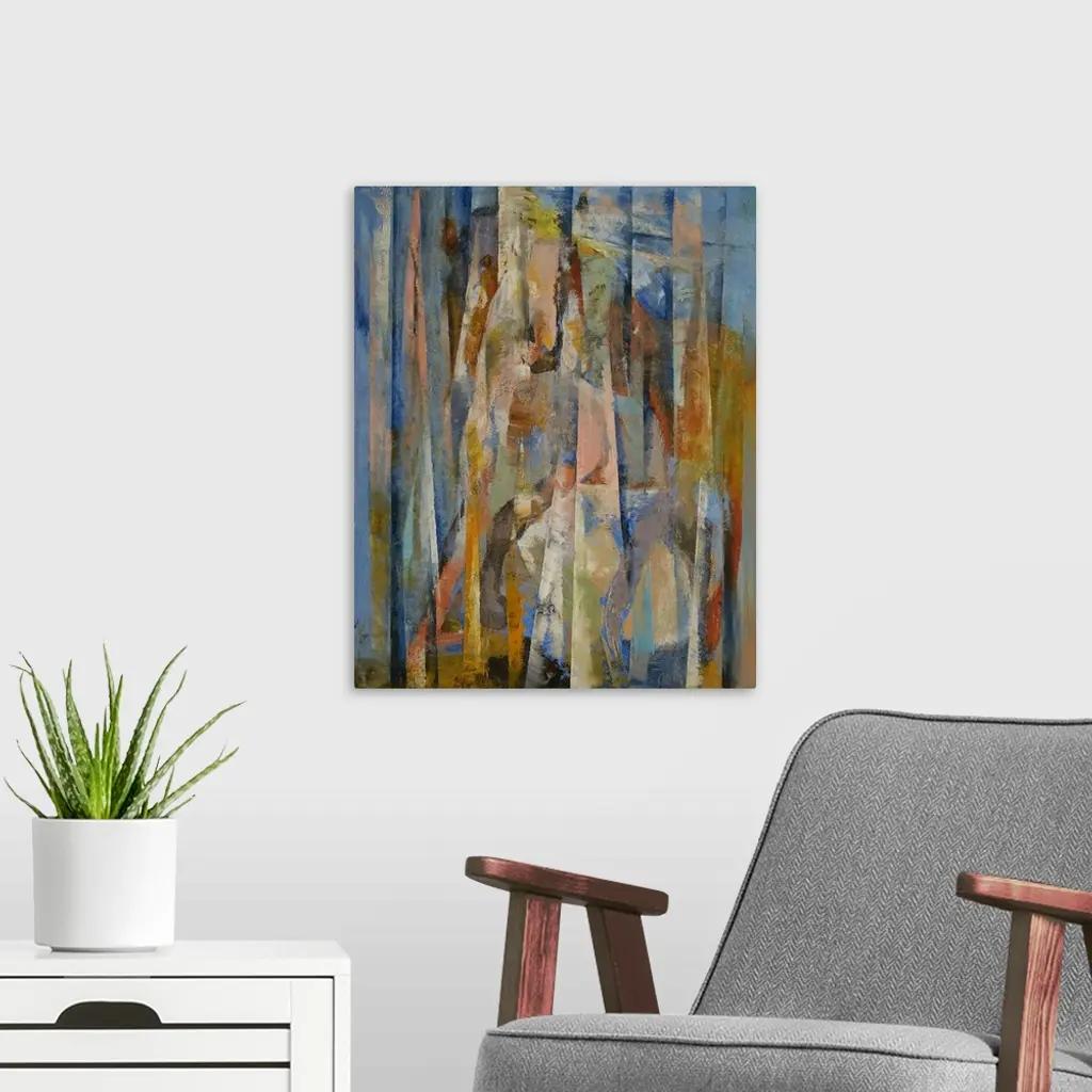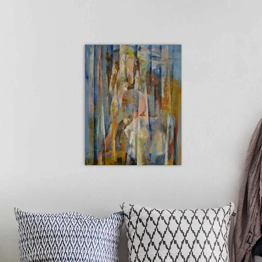 Tall abstract painting on canvas of horses with vertical lines of color.