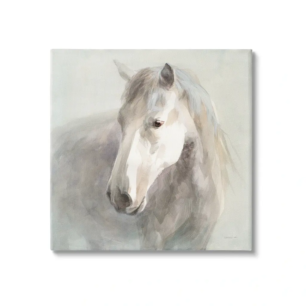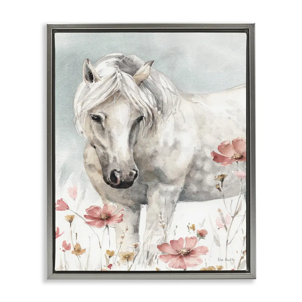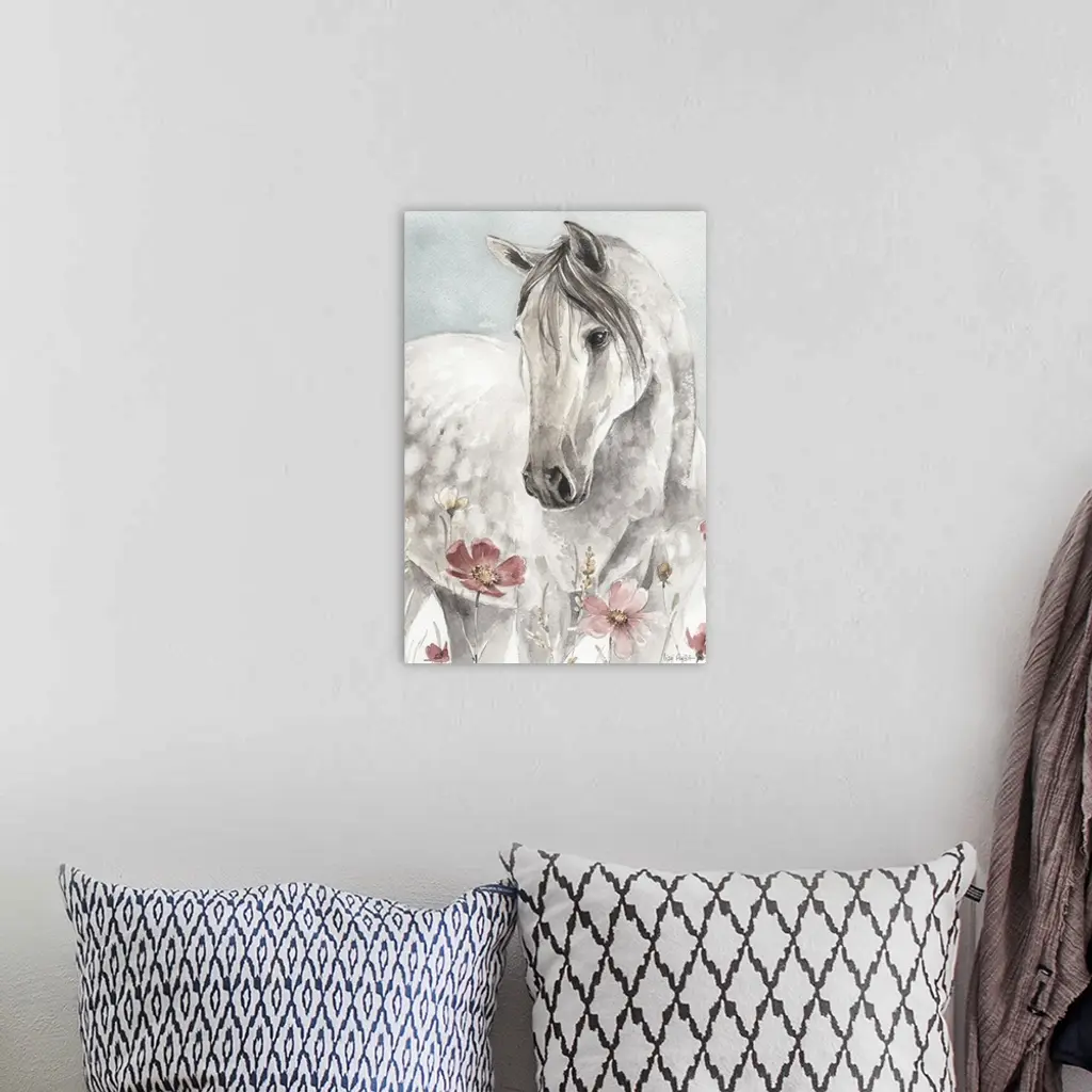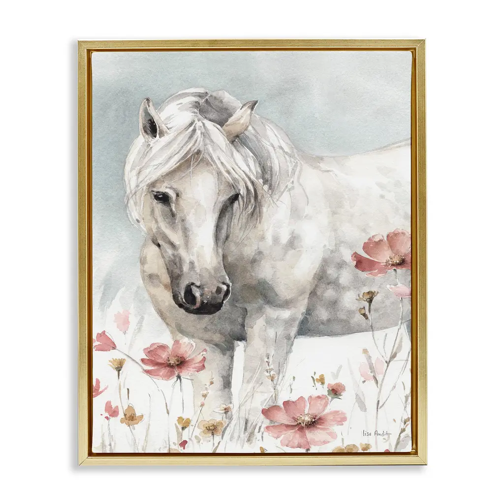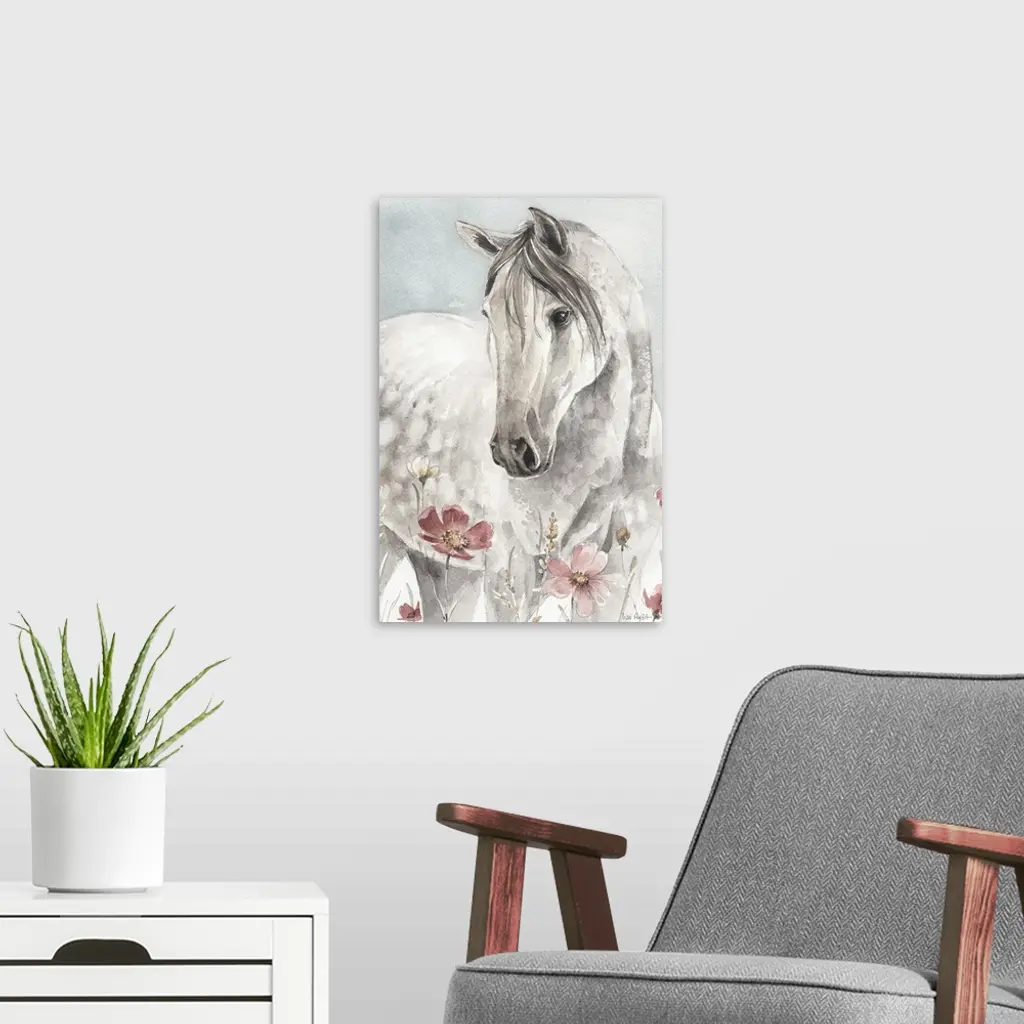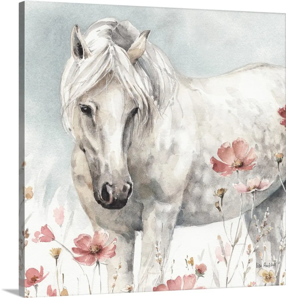 Contemporary watercolor artwork of a white horse in a field of wildflowers.