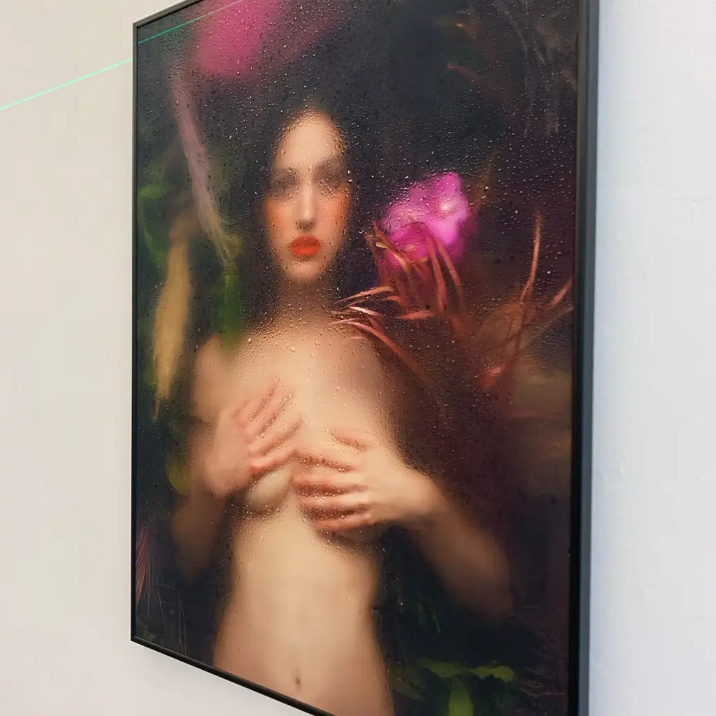 A nude model surrounded by colorful floral compositions is the romantic subject Gradella captured through a translucent panel for this refined photographic portrait. Impressed on 100% vegetal paper, its retouch-free quality allows for a faithful rendering of the surface effect, making this fine-art print an authentic work of art. Please contact the Concierge for available variants and customizations.