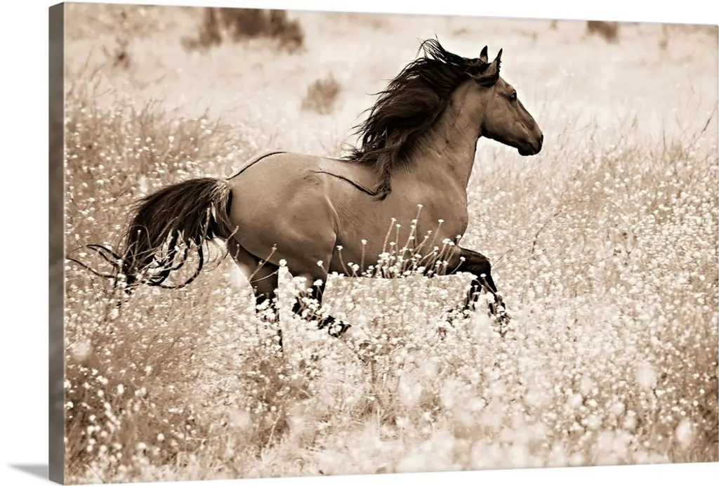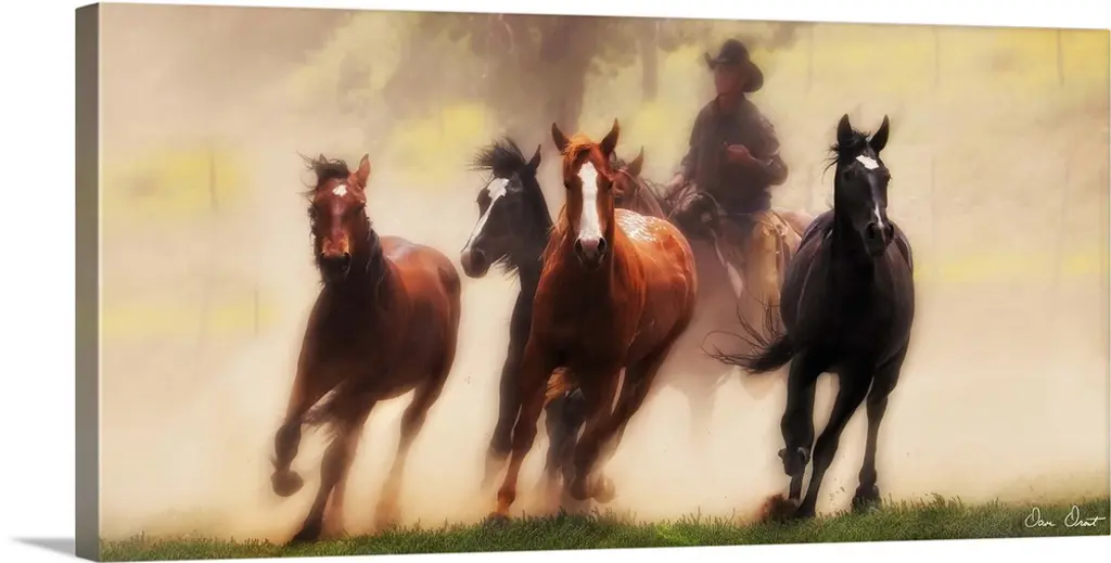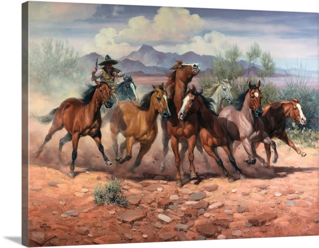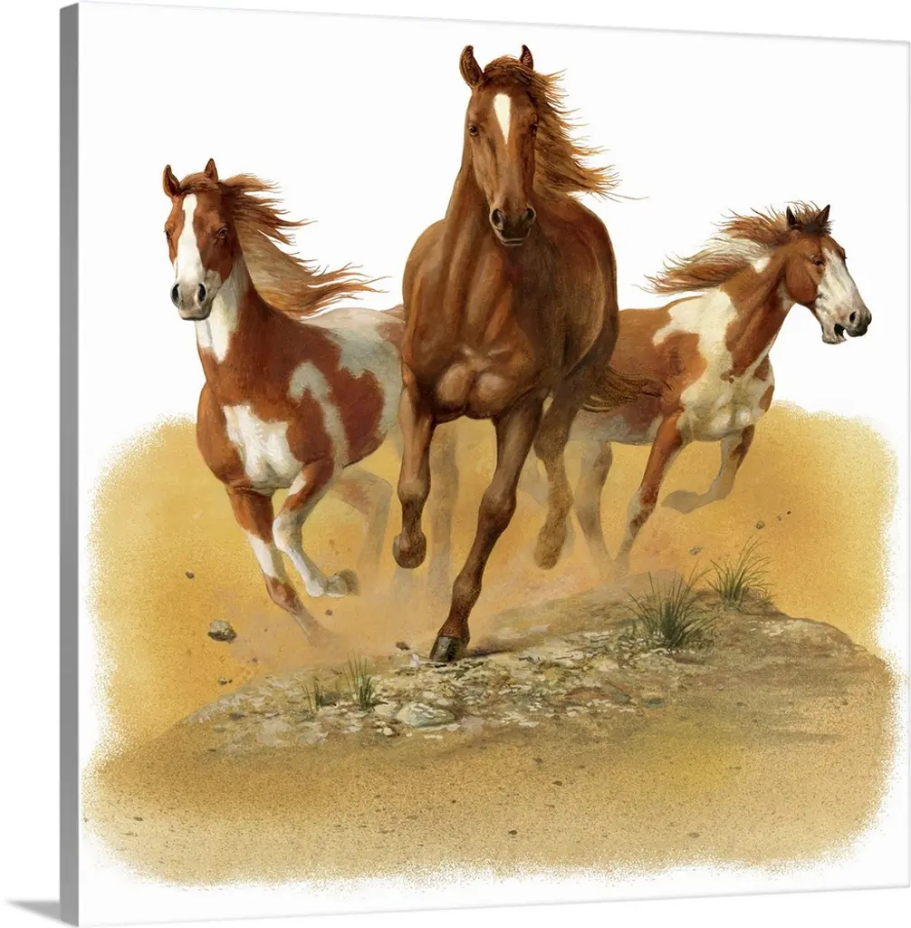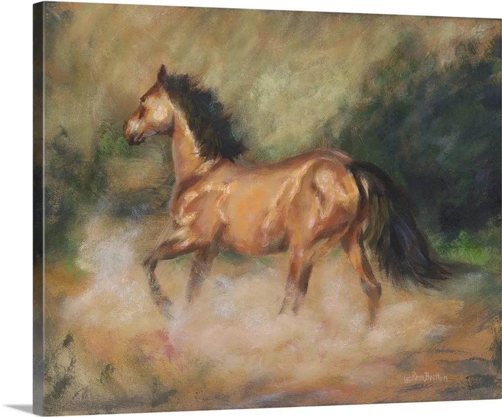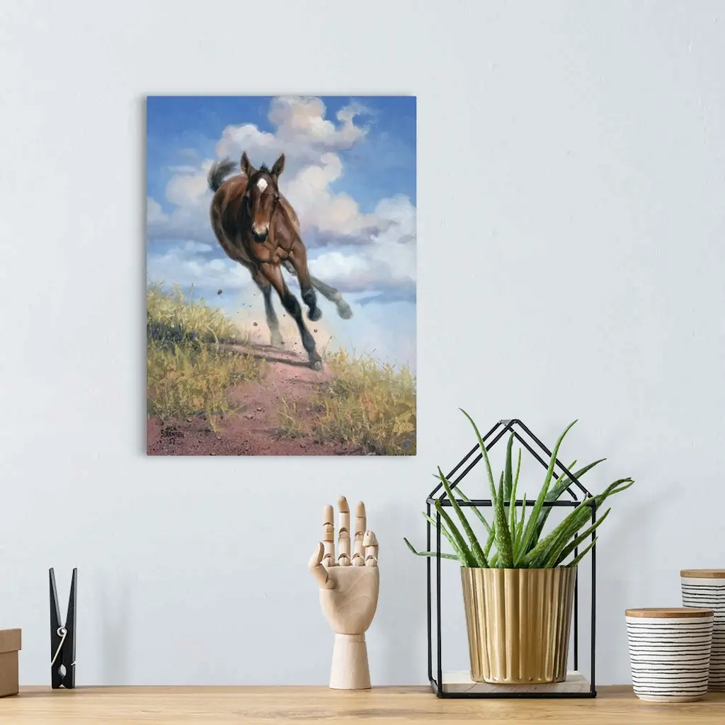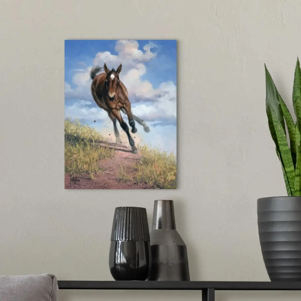 Lively brush strokes that create an active horse running through a trail against puffy white clouds in this contemporary artwork.