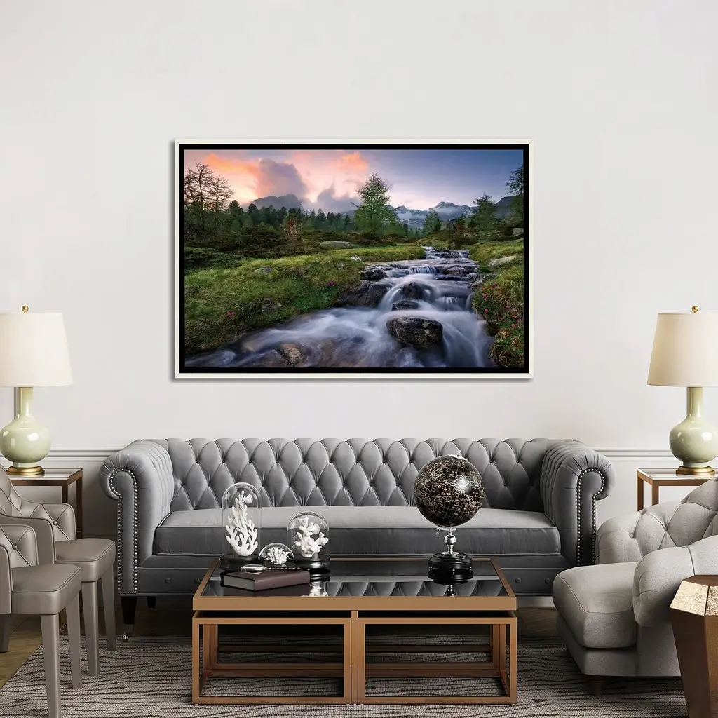 Great Art Deserves to be on Canvas! Unlike thin posters and paper prints, Giclée canvas artwork offers the texture, look and feel of fine-art paintings. This artwork is crafted in the USA with artist-grade canvas, professionally hand-stretched and stapled over North American pine-wood bars in Gallery Wrap style; a method utilized by artists to present artwork in galleries. Your Gallery-Wrapped Canvas comes mounted to a 2 inch thick, elegant hard wood frame. The art is inset, leaving a 3/8" space between the art and frame; creating a "floating" illusion. Fade-resistant archival inks guarantee perfect color reproduction that remains vibrant for decades even when exposed to strong light. Add brilliance in color and exceptional detail to your space with this contemporary and uncompromising style!