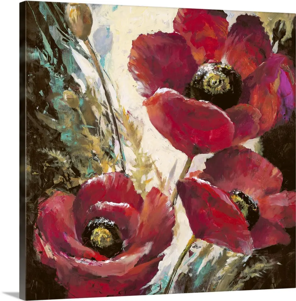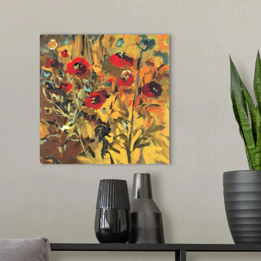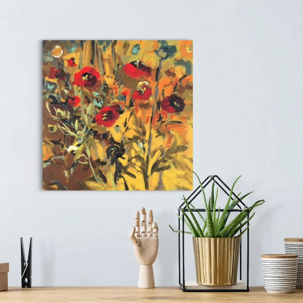 Square painting of flowers, some open and some closed, against a bright background.