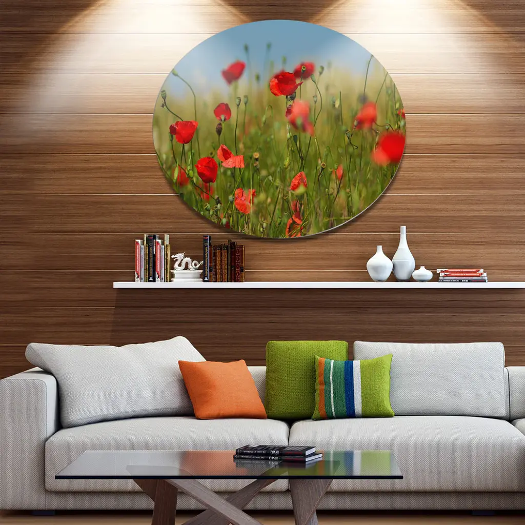 Wild Poppy Flowers In Green Garden, Floral Wall Disc Metal Artwork, 11"