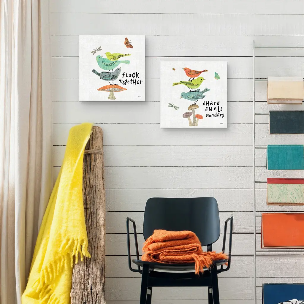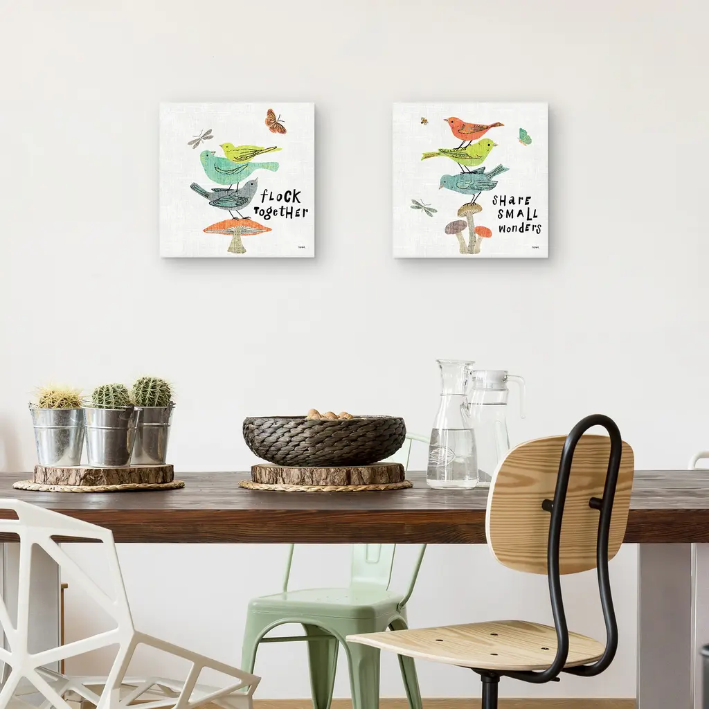 Each canvas features three birds, perched on a toadstool, while they both proclaim their own sweet sentiment. One print urges you and your family to "flock together", while the other reminds you to "share small wonders". This darling set of bird prints, with their soft pastel color palette and messages of unity, is perfect for your home. This set of giclee prints combine extraordinary detail and quality canvas into one affordable package. Offering full-bleed printing, which covers the entirety of the canvas, your new artworks also come ready to hang; eliminating the need for framing.