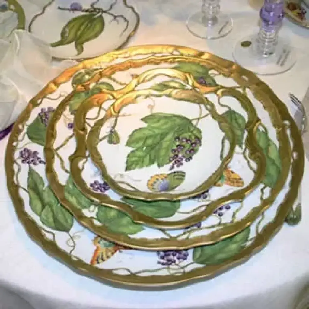 With a sweet mix of berries, butterflies, and green leaves, Wildberries dinnerware is vibrant and fresh. Raised relief and edged in gold. Available with lavender berries or red berries. Five piece place setting includes dinner plate, dessert plate, bread & butter plate, tea cup and saucer. Anna Weatherley’s designs are based on botanical sketches from the 18th century as well as Dutch still-life paintings. At home, we find her pieces look just as good on our tables as they do on our walls. Fashion designer, socialite, and artist Anna Weatherley's signature style of butterflies, flowers, and botanical drawings is brought by artists in her factory in Budapest, Hungary. There, they hand-paint and decorate each piece to create a unique work of art that brings beauty to your home all year.