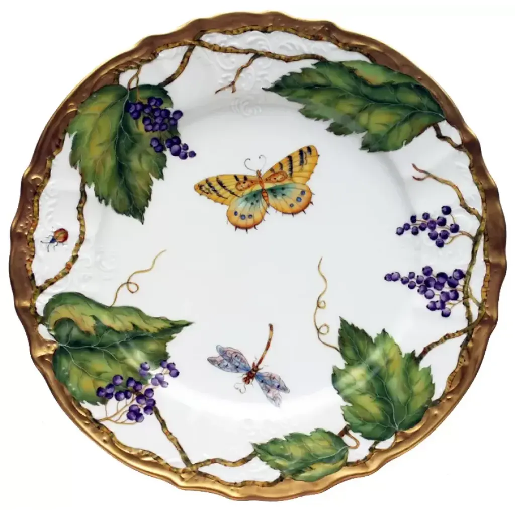 With a sweet mix of berries, butterflies, and green leaves, Wildberries dinnerware is vibrant and fresh. Raised relief and edged in gold. Available with lavender berries or red berries. Five piece place setting includes dinner plate, dessert plate, bread & butter plate, tea cup and saucer. Anna Weatherley’s designs are based on botanical sketches from the 18th century as well as Dutch still-life paintings. At home, we find her pieces look just as good on our tables as they do on our walls. Fashion designer, socialite, and artist Anna Weatherley's signature style of butterflies, flowers, and botanical drawings is brought by artists in her factory in Budapest, Hungary. There, they hand-paint and decorate each piece to create a unique work of art that brings beauty to your home all year.