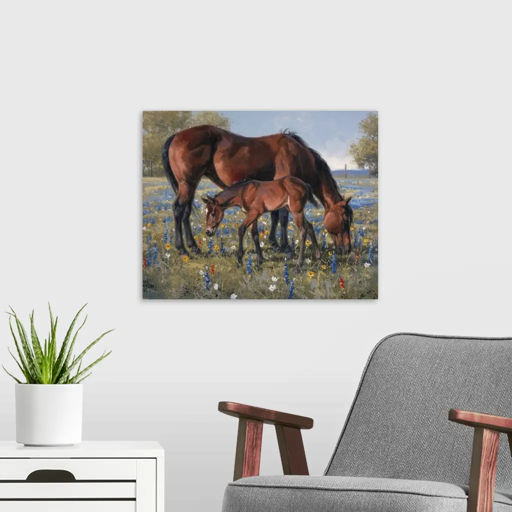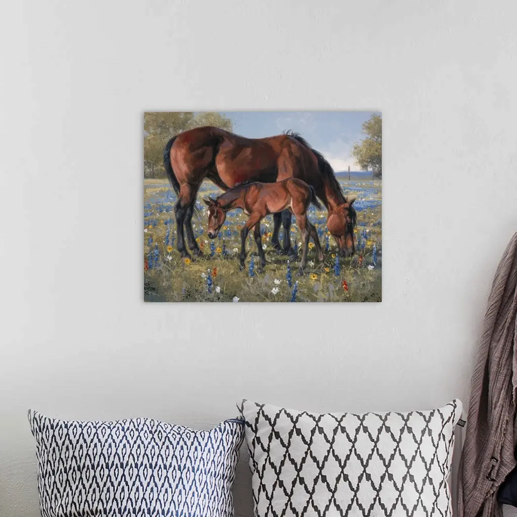 Contemporary artwork of lively brush strokes that create a serene countryside landscape filled with wildflowers and two horses grazing.