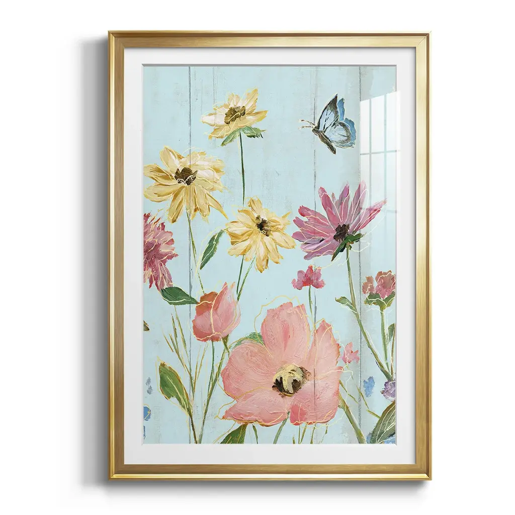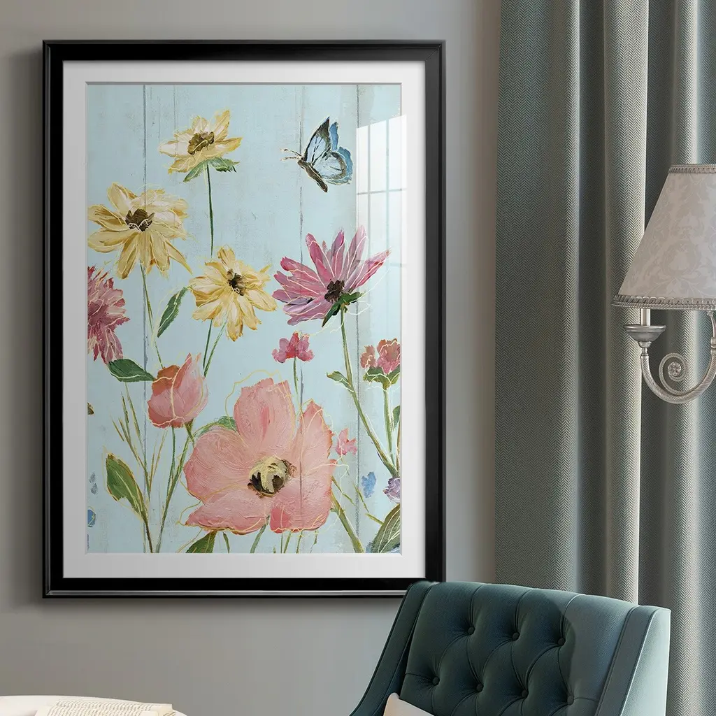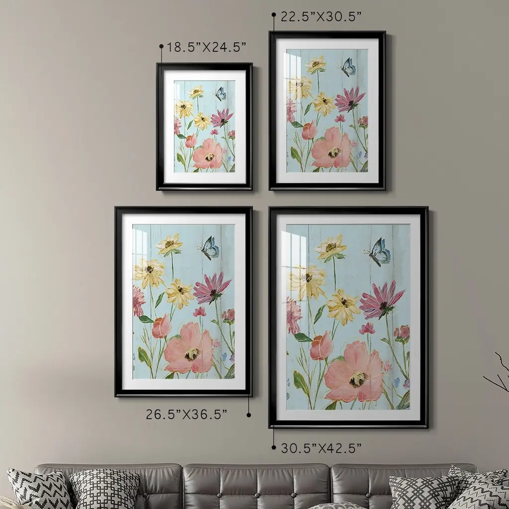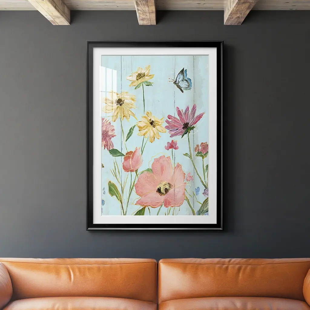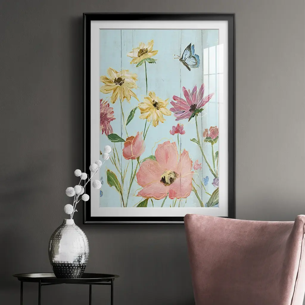 Wildflower Flutter II Premium Framed Print - Ready to Hang A Premium Framed Print created to last. Framed in distressed wood and available in an array of sizes and colors Featuring a beveled a solid wood stretcher bar, each piece comes ready to hand 4 SIZES AVAILABLE 30.5''X42.5'' - Overall Size 26.5'X36.5'' - Overall Size 22.5''x30.5'' - Overall Size 18.5''x24.5'' - Overall Size Each piece is made to order. Each piece comes with hanging hardware. Made in the USA Ready to Hang Giclee Paper Print Acrylic Glass Beveled Matt Board
