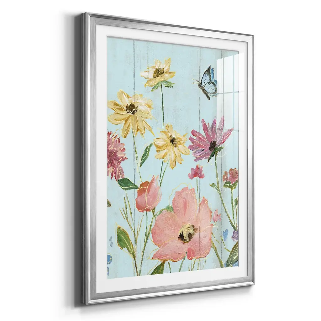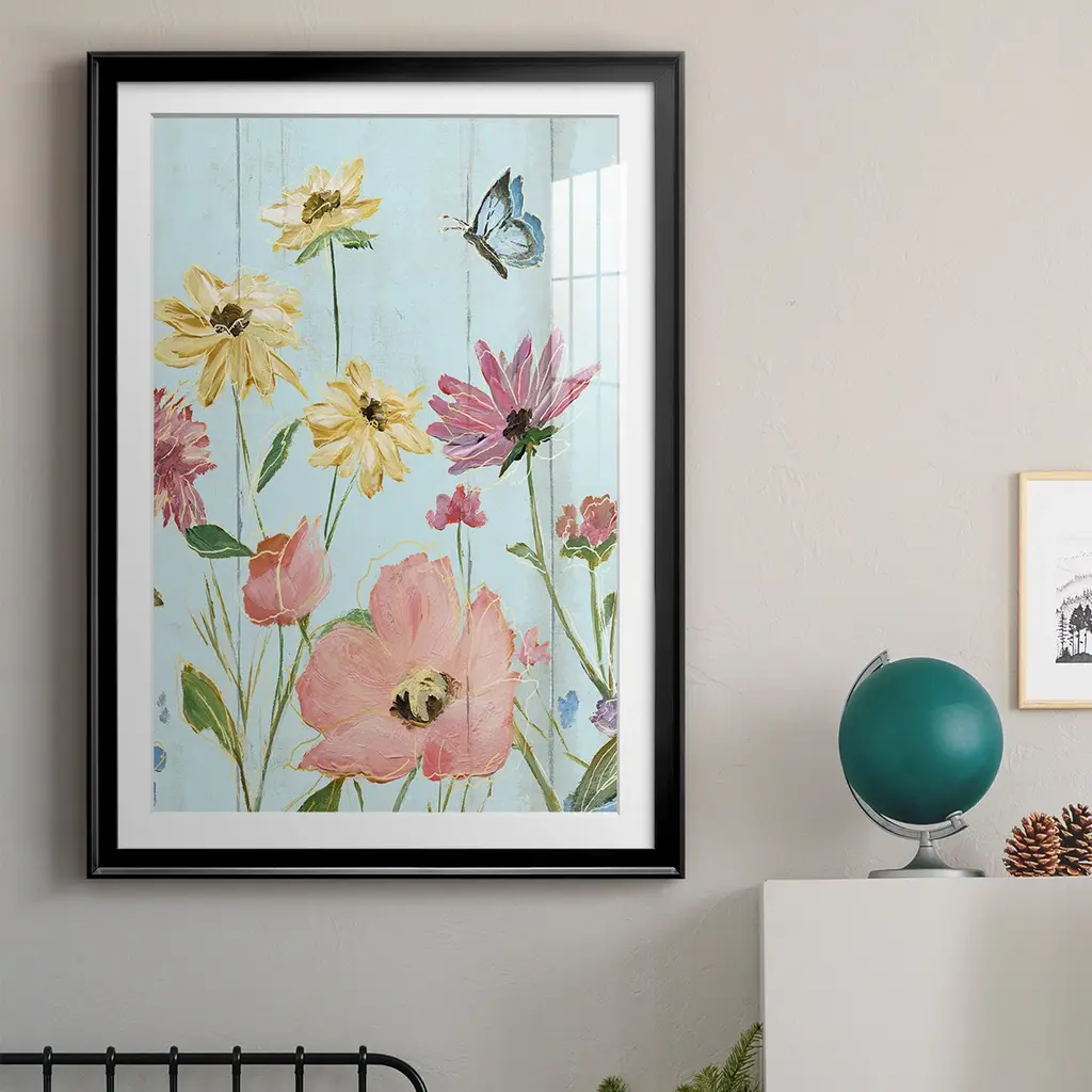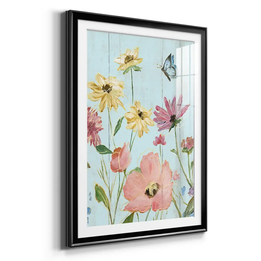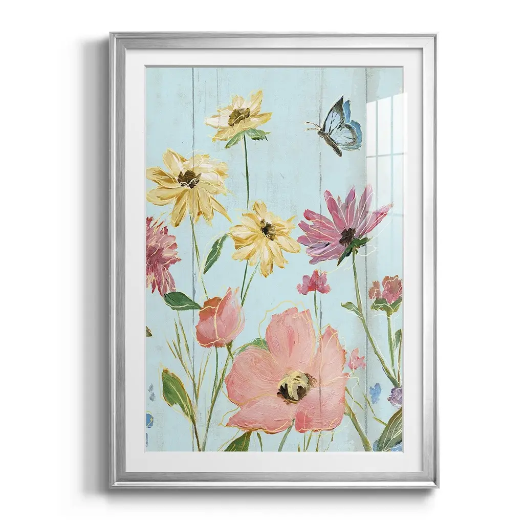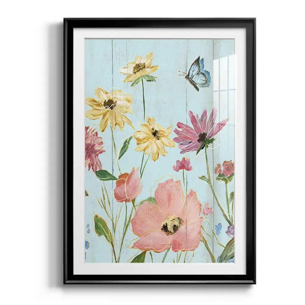 Wildflower Flutter II Premium Framed Print - Ready to Hang A Premium Framed Print created to last. Framed in distressed wood and available in an array of sizes and colors Featuring a beveled a solid wood stretcher bar, each piece comes ready to hand 4 SIZES AVAILABLE 30.5''X42.5'' - Overall Size 26.5'X36.5'' - Overall Size 22.5''x30.5'' - Overall Size 18.5''x24.5'' - Overall Size Each piece is made to order. Each piece comes with hanging hardware. Made in the USA Ready to Hang Giclee Paper Print Acrylic Glass Beveled Matt Board