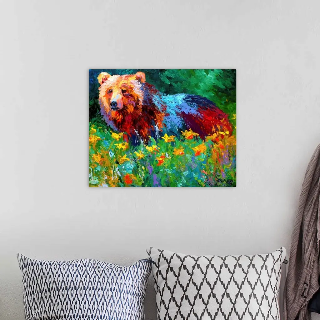 Impressionalistic painting of a large bear in the middle of a field of flowers with a forest in the background.