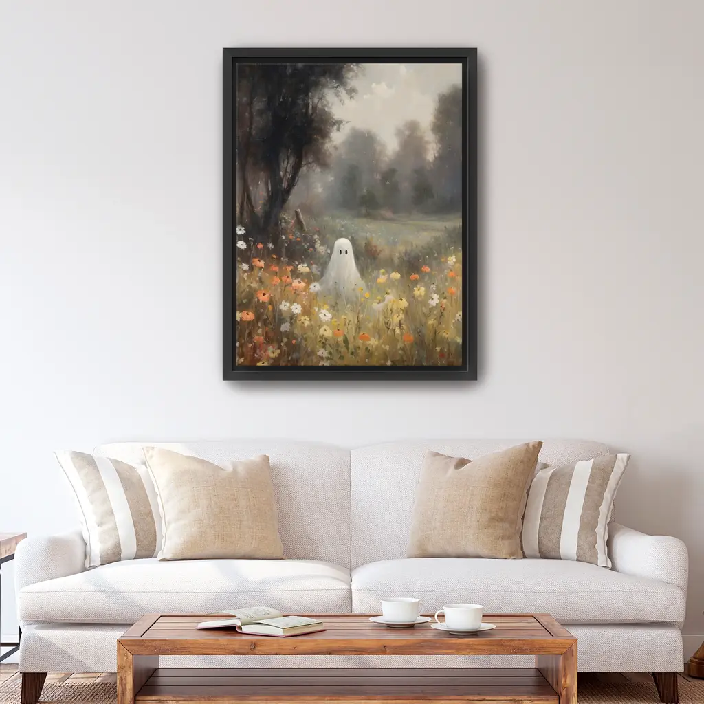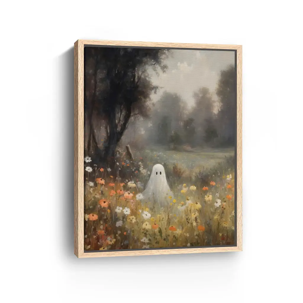A spectral figure stands quietly in a field of fading flowers, casting soft light through swirling fog. Deep charcoal, muted orange, and soft green tones evoke a sense of mystery and seasonal magic. Our Gallery Wrap Canvas Prints are proudly assembled with high quality materials in California, USA. Each piece is printed on a thick, archival grade canvas using Giclee technology. It is then hand-stretched by our experienced artisans over solid wood bars, which will not warp over time. The final product is a piece personally crafted for you to confidently display on your wall. Care and Assembly: Ensure that the location of your piece has little to no exposure to heat, sunlight, and moisture. Wipe clean, only if needed. Each piece includes hanging hardware to hang on your wall vertically.