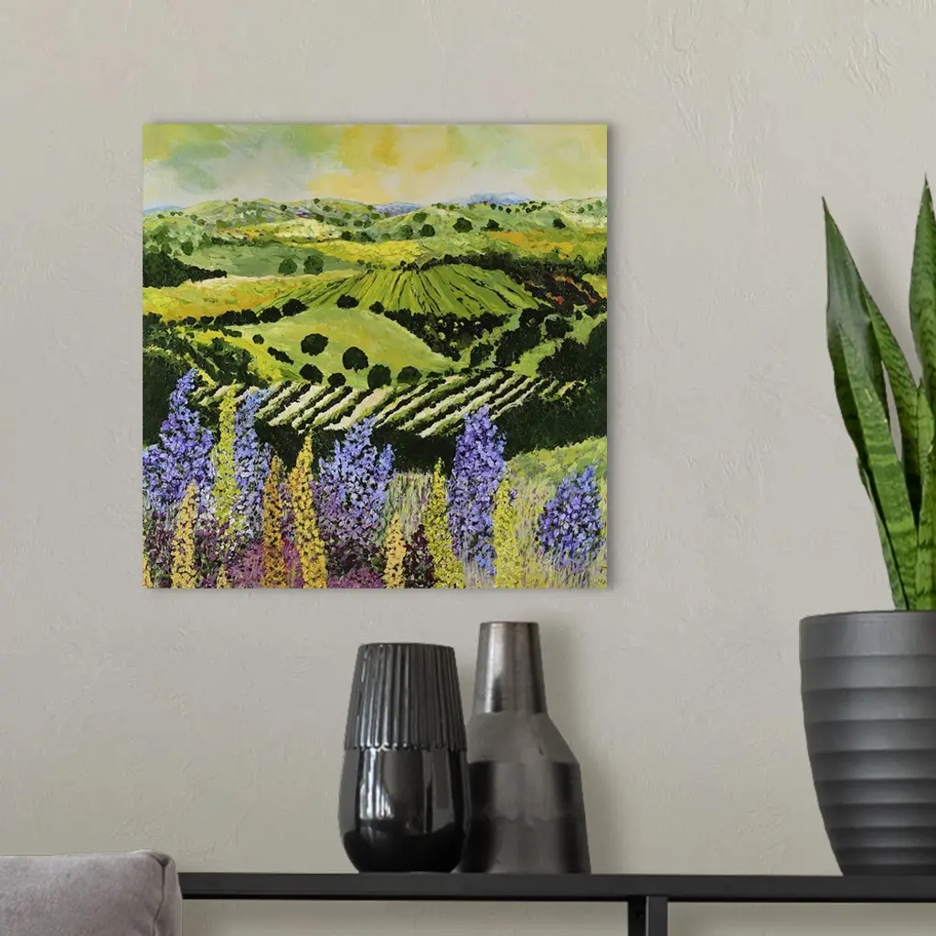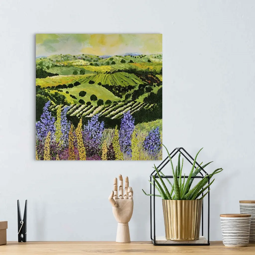 Contemporary painting of a country landscape with lilacs overlooking rows of crops and hilly farmland.