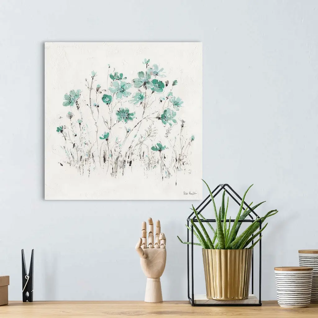 Contemporary artwork of turquoise wildflowers sprouting from a textured white background.