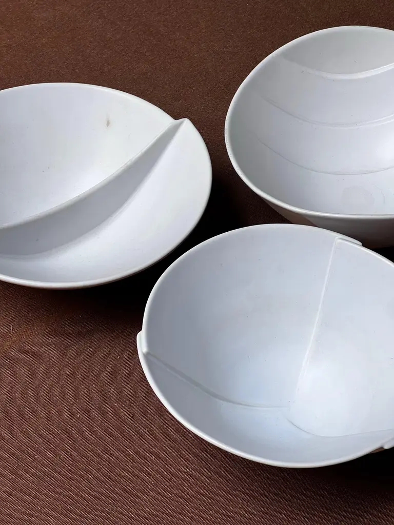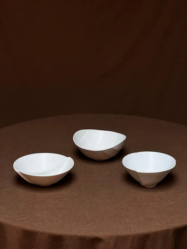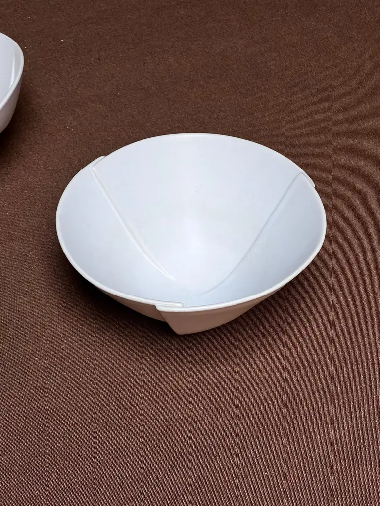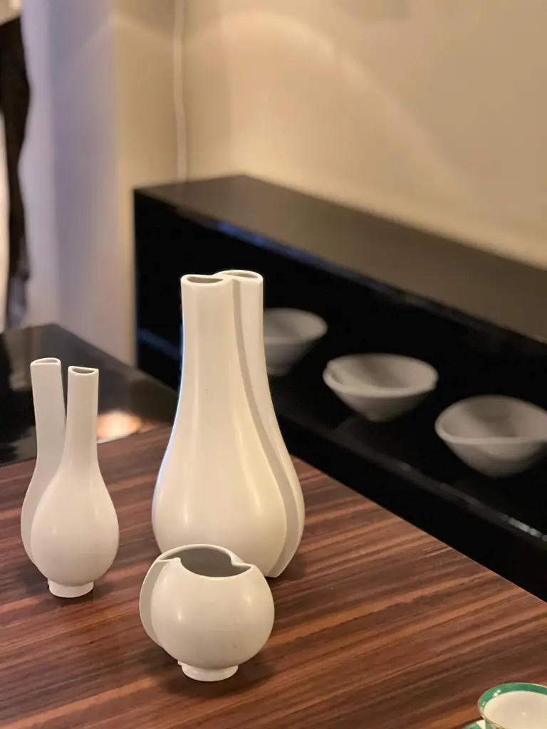 Series of 3 bowls in powerful white glaze by master ceramicist Wilhelm Kage. It’s a series he worked on int he late 1930’s. The idea behind those pieces is to cut them then reassemble. It creates an incredibly modern and vibrant result. beautiful shadows. We have more works from this series since we collected them for years. Wilhelm Kåge (6 March 1889 – 25 November 1960) was a Swedish artist and designer, mainly known as a ceramic designer and as the artistic leader of the Gustavsberg porcelain factory.Kåge studied decorative painting at Tekniska skolan in Stockholm and later for the painter Carl W. Wilhelmson in Gothenburg, Johan Rohde in Copenhagen and at Plakatschule in Munich, where he learnt graphic techniques.His early career was dedicated to advertising and the production of posters, but his best known work was in ceramics, begun when he was appointed artistic leader of Gustavsberg in 1917, remaining there until 1949, when he was succeeded by Stig Lindberg. He was presented with the Prince Eugen Medal for design that same year.The focus of Kåge's early ceramic designs, as of much of Swedish design of this period was on practical solutions to social issues, an example of which was his Praktika (1933), a simply designed and stackable set of tableware aimed at working-class families. Praktika was a commercial failure, as the intended buyers preferred more traditional and ornate products.