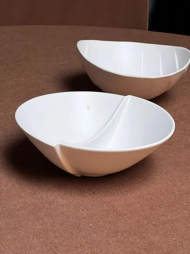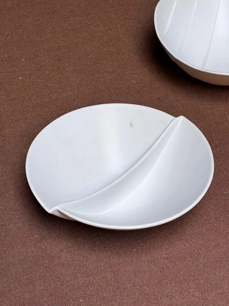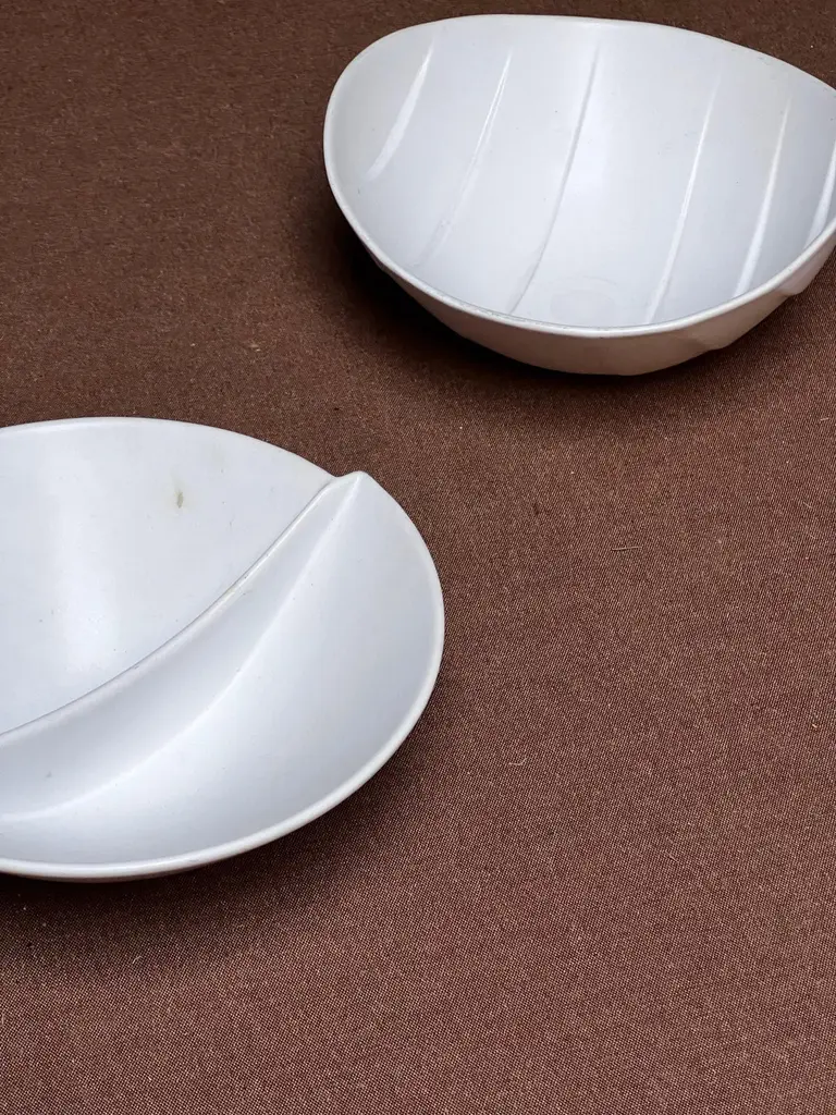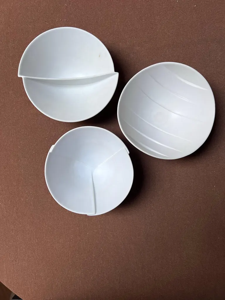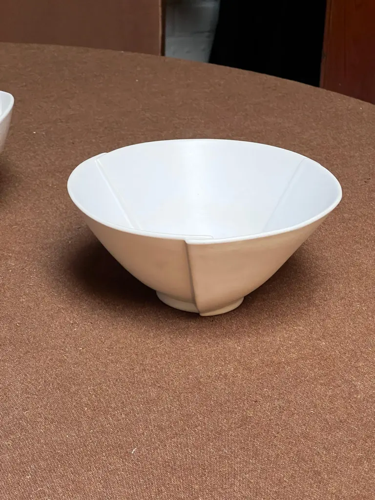 Series of 3 bowls in powerful white glaze by master ceramicist Wilhelm Kage. It’s a series he worked on int he late 1930’s. The idea behind those pieces is to cut them then reassemble. It creates an incredibly modern and vibrant result. beautiful shadows. We have more works from this series since we collected them for years. Wilhelm Kåge (6 March 1889 – 25 November 1960) was a Swedish artist and designer, mainly known as a ceramic designer and as the artistic leader of the Gustavsberg porcelain factory.Kåge studied decorative painting at Tekniska skolan in Stockholm and later for the painter Carl W. Wilhelmson in Gothenburg, Johan Rohde in Copenhagen and at Plakatschule in Munich, where he learnt graphic techniques.His early career was dedicated to advertising and the production of posters, but his best known work was in ceramics, begun when he was appointed artistic leader of Gustavsberg in 1917, remaining there until 1949, when he was succeeded by Stig Lindberg. He was presented with the Prince Eugen Medal for design that same year.The focus of Kåge's early ceramic designs, as of much of Swedish design of this period was on practical solutions to social issues, an example of which was his Praktika (1933), a simply designed and stackable set of tableware aimed at working-class families. Praktika was a commercial failure, as the intended buyers preferred more traditional and ornate products.