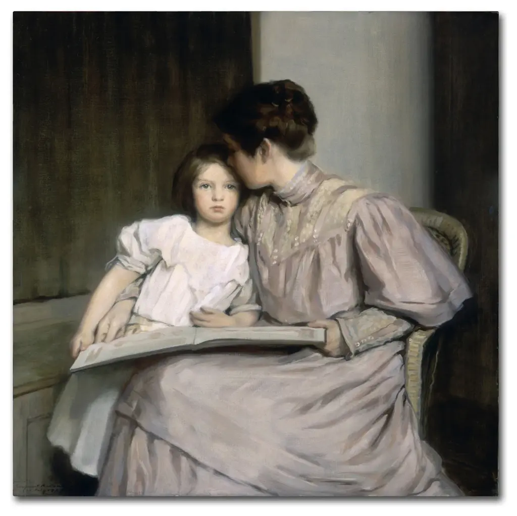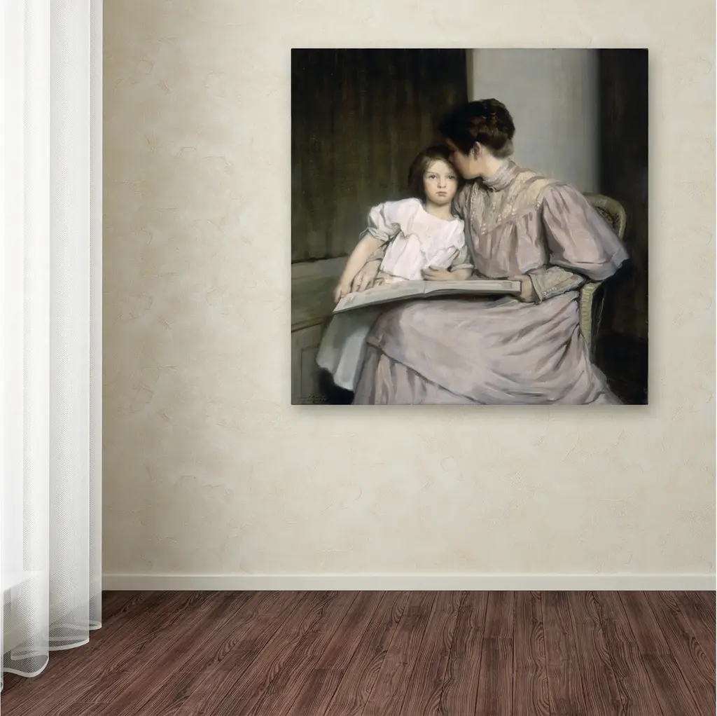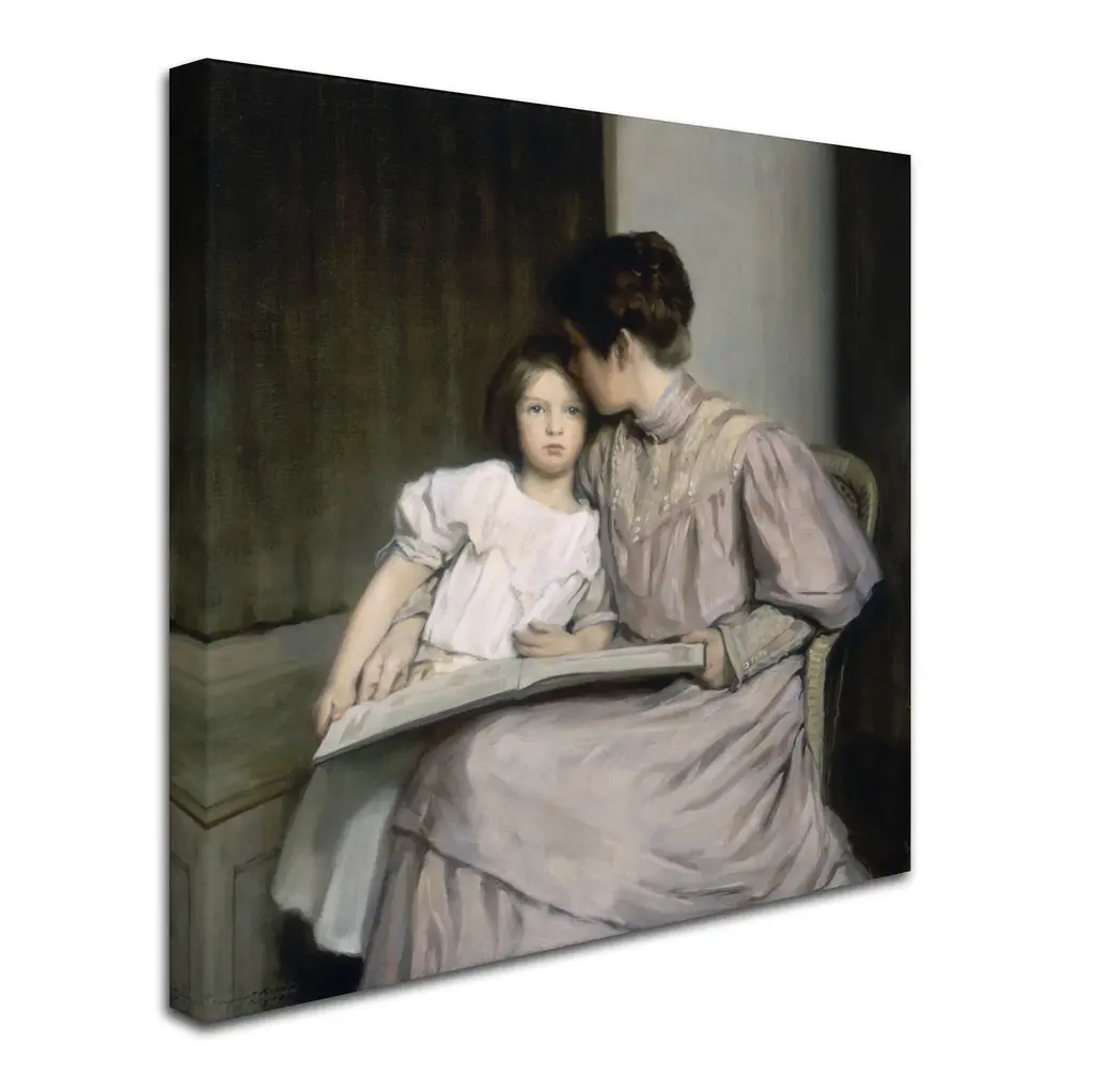 Artist: William Sergeant KendallSubject: PeopleStyle: TraditionalProduct Type: Gallery-Wrapped Canvas ArtMade in USAThis ready to hang, gallery-wrapped art piece features a woman sitting with a child.William Sergeant Kendall was an American painter famous for his evocative scenes of domestic life. Kendall frequently painted his wife and three daughters, also modeling and carving sculptures throughout his career. After studying in Paris, Kendall returned to America to become a professor and head of the School of Fine Arts at Yale. His later titles included Academician of the National Academy of Design, member of the National Institute of Arts and Letters, and member of the U.S. Commission of Fine Arts.Giclee (jee-clay) is an advanced printmaking process for creating high quality fine art reproductions. The attainable excellence that Giclee printmaking affords makes the reproduction virtually indistinguishable from the original piece. The result is wide acceptance of Giclee by galleries, museums, and private collectors. Gallery wrap is a method of stretching an artist's canvas so that the canvas wraps around the sides and is secured a hidden, wooden frame. This method of stretching and preparing a canvas allows for a frameless presentation of the finished painting.