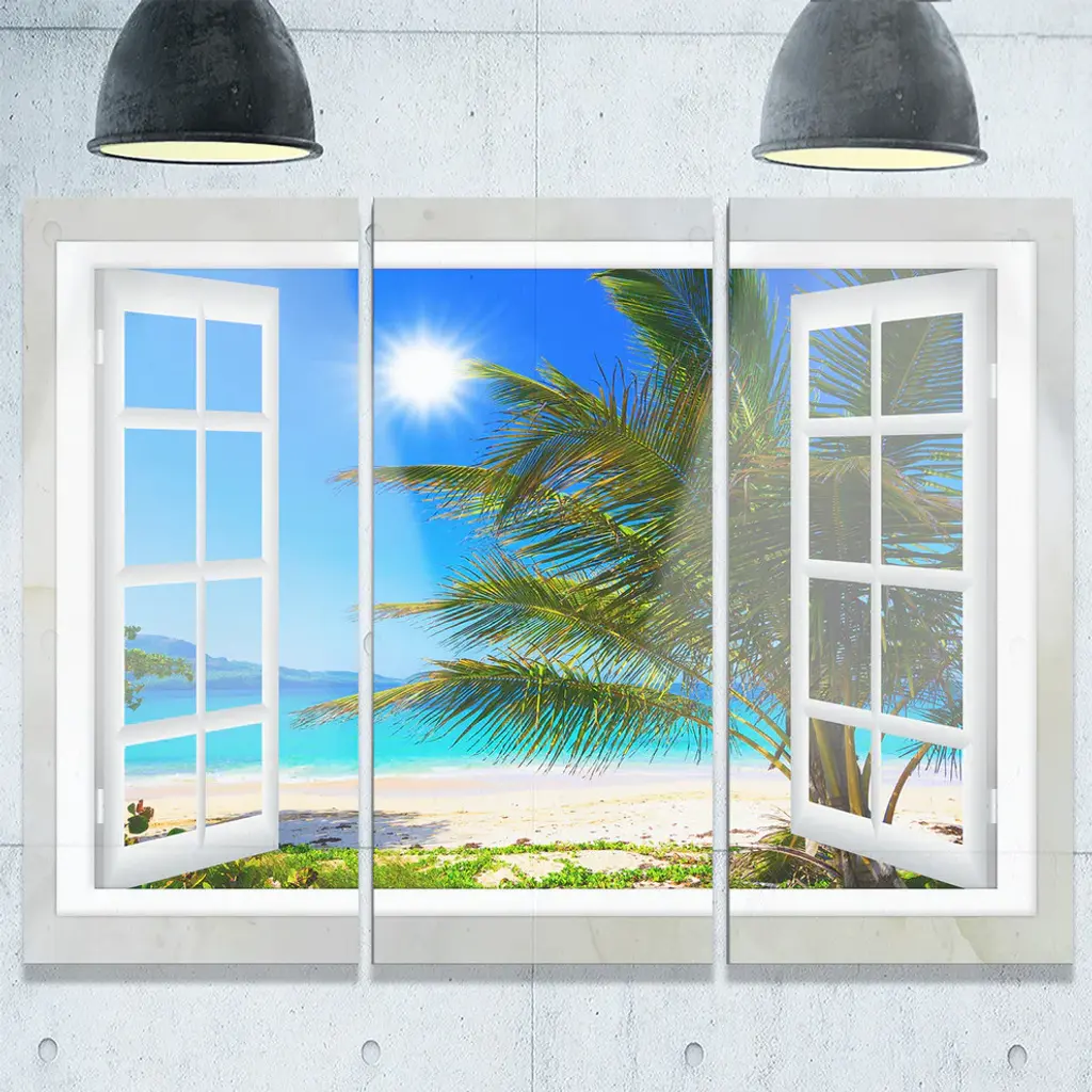 "Window Open To Beach With Palm" Metal Wall Art, 3 Panels, 36"x28"